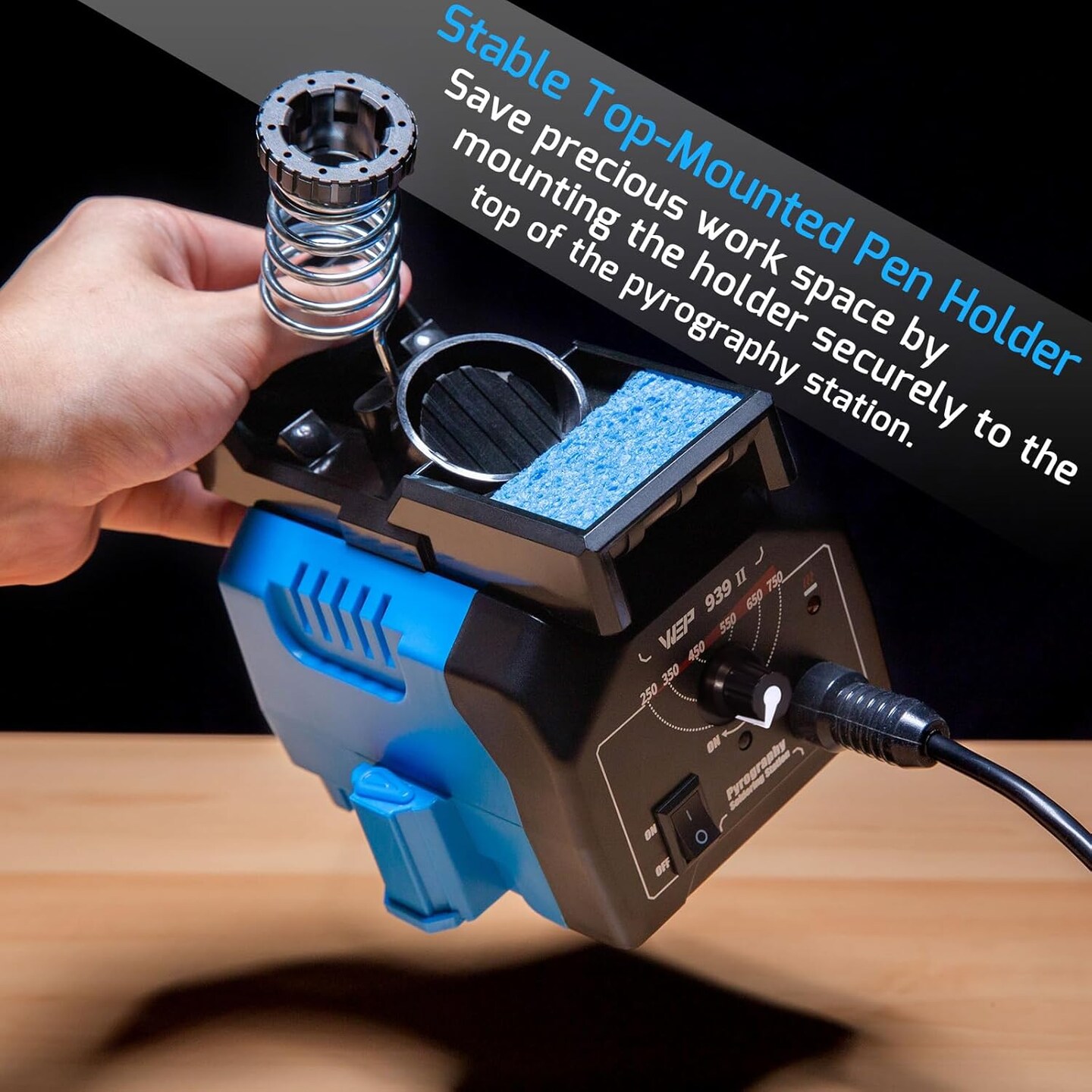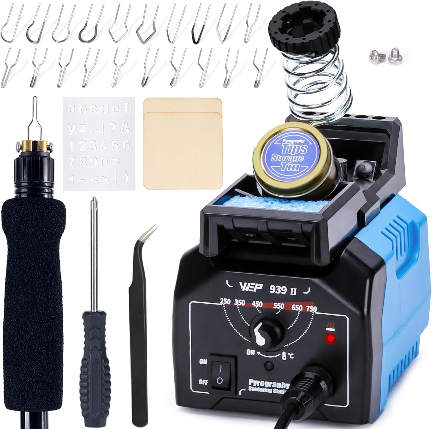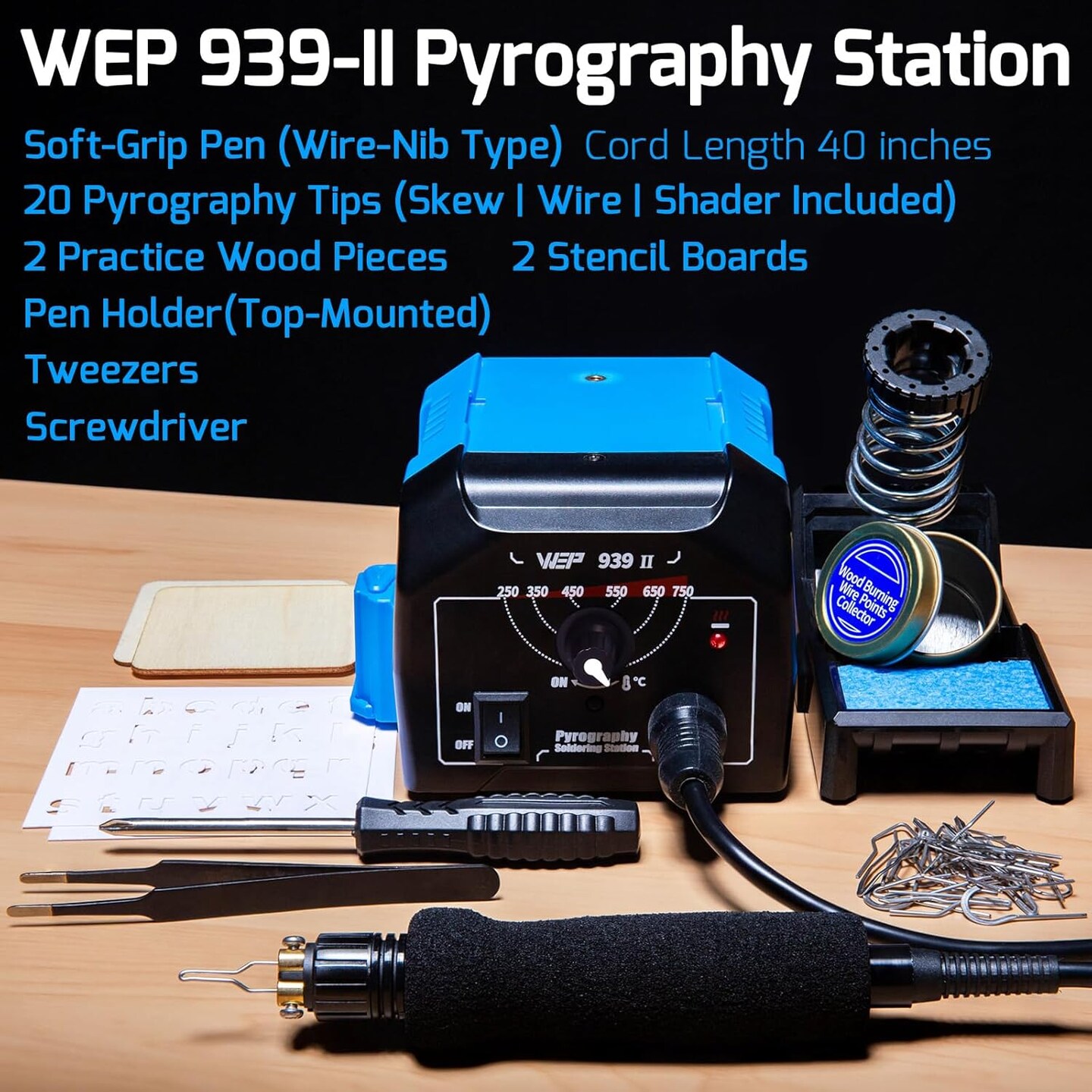 939-II Pyrography Wood Burning Kit 32-in-1 – Comfort Pen, 20 Tips, 2 Stencils, 2 Wood Pieces & Pen Holder.