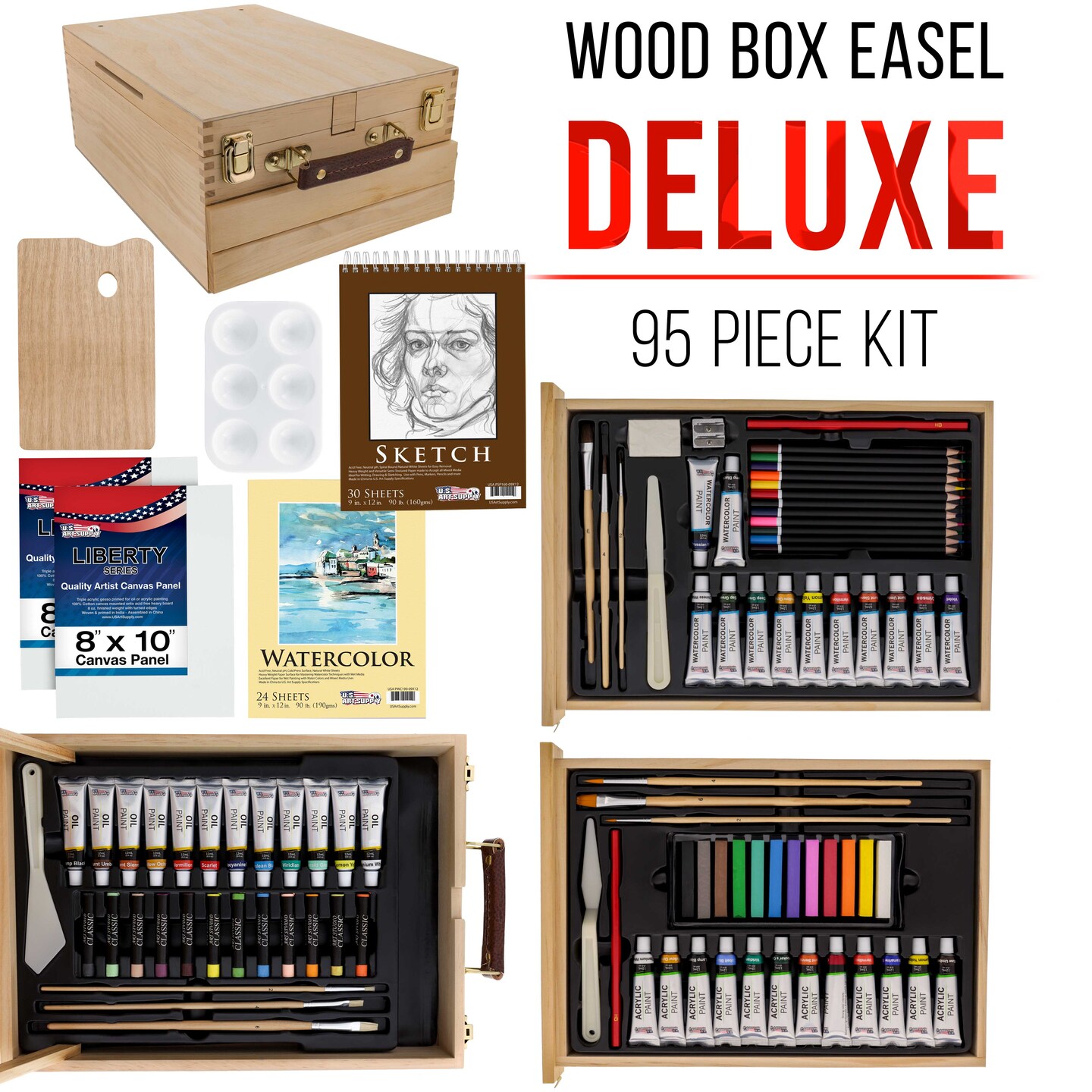 95 Piece Wood Box Easel Painting Set - Oil, Acrylic, Watercolor Paint Colors & Paint Brushes, Oil Artist Pastels, Pencils, Watercolor & Sketch Pads