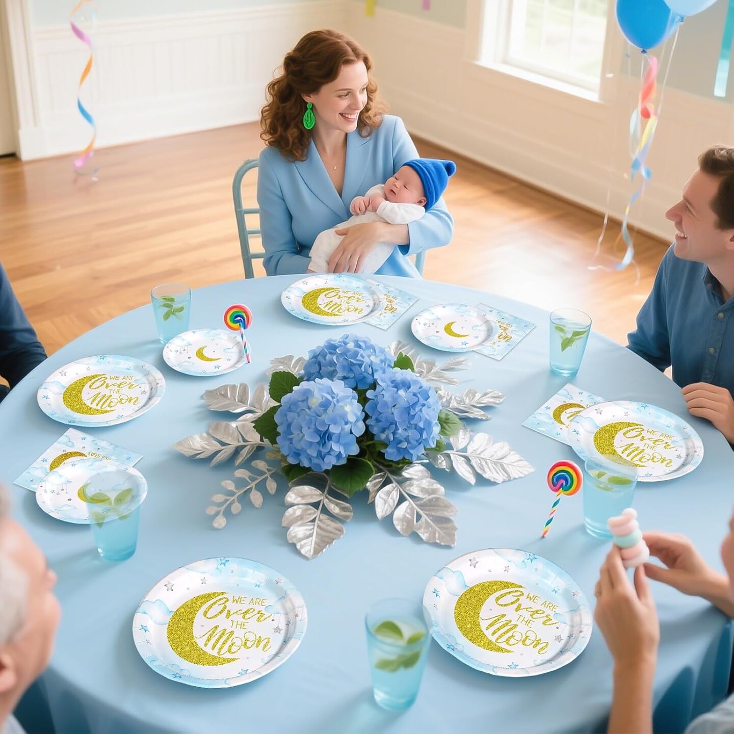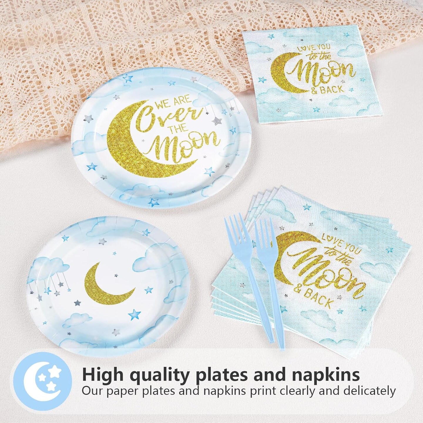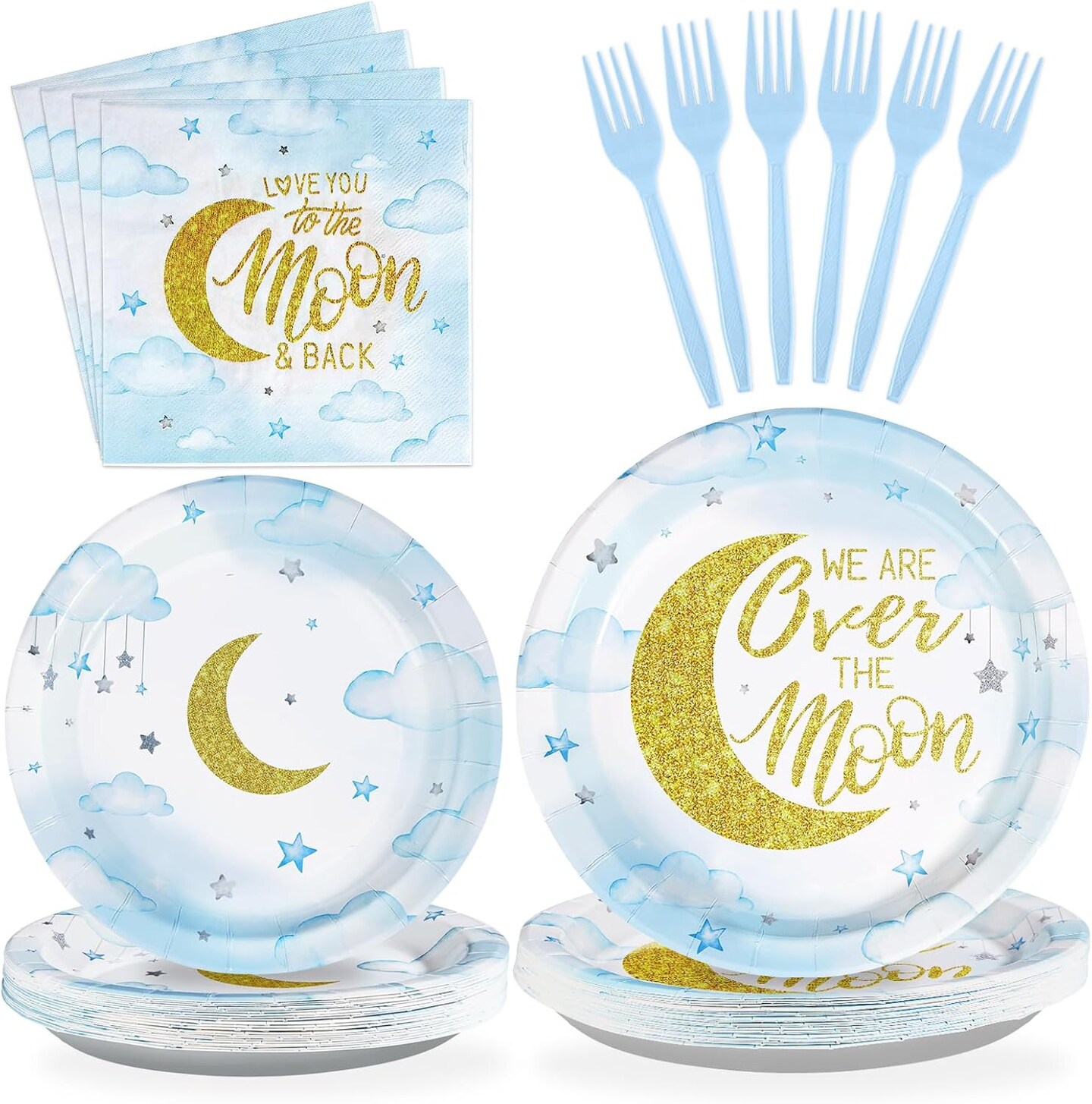96 Pcs Baby Shower Tableware Set - Plates, Napkins, Forks (Blue)
