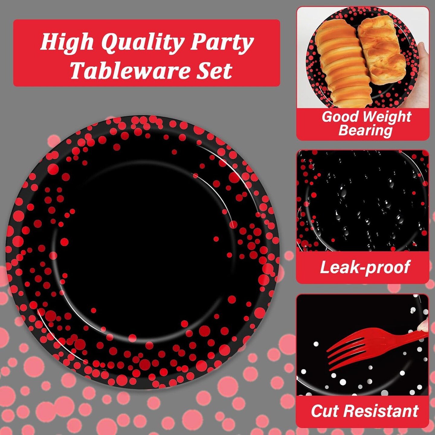 96 Pcs Black and Red Party Plates and Napkins Party Supplies Red Dot on Black Party Birthday Tableware Set Decorations Favors for Birthday Baby Shower Serves 24