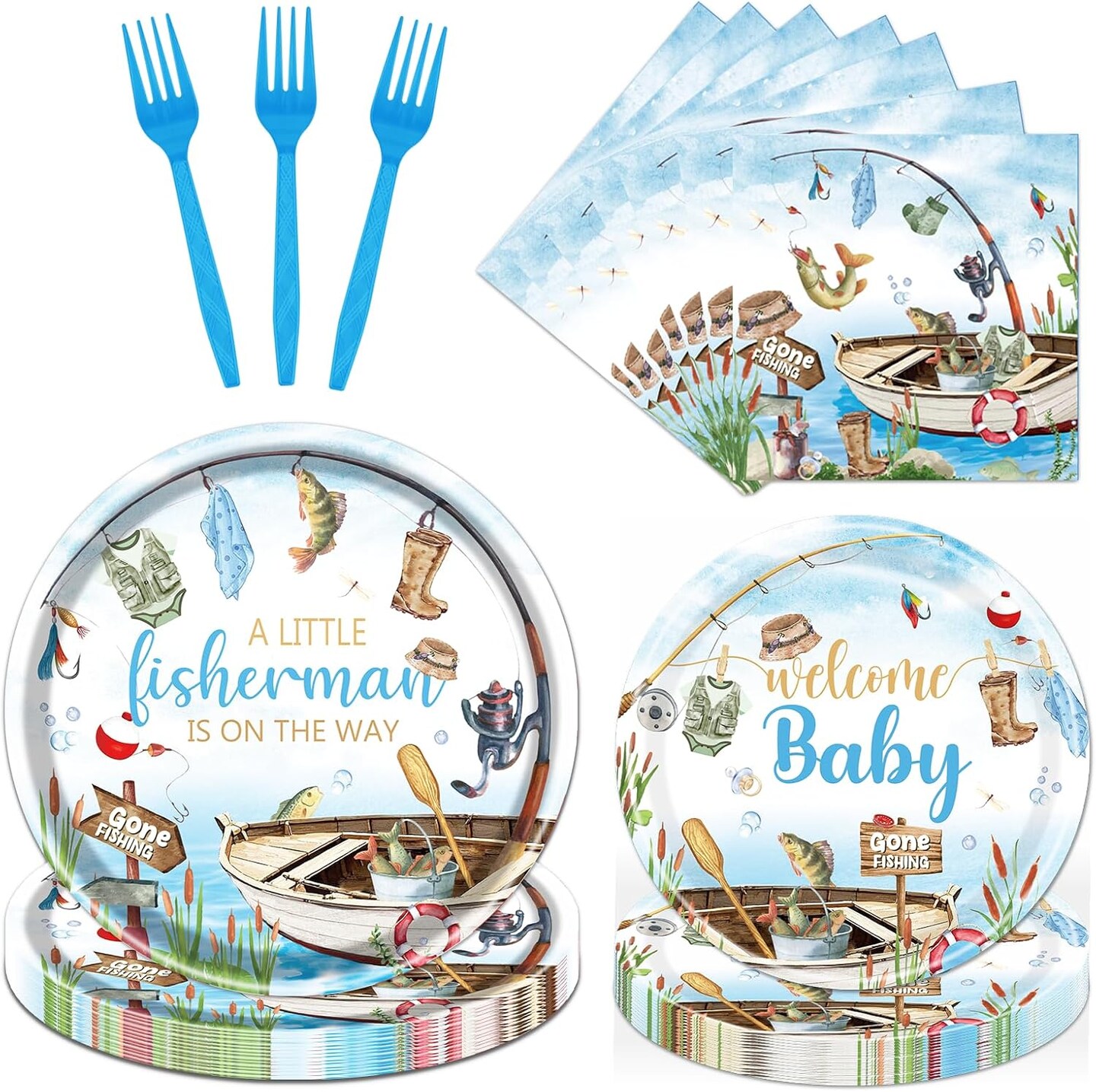 96 Pcs Fishing Baby Shower Tableware Set – Fish Theme Plates & Napkins (Colorful)