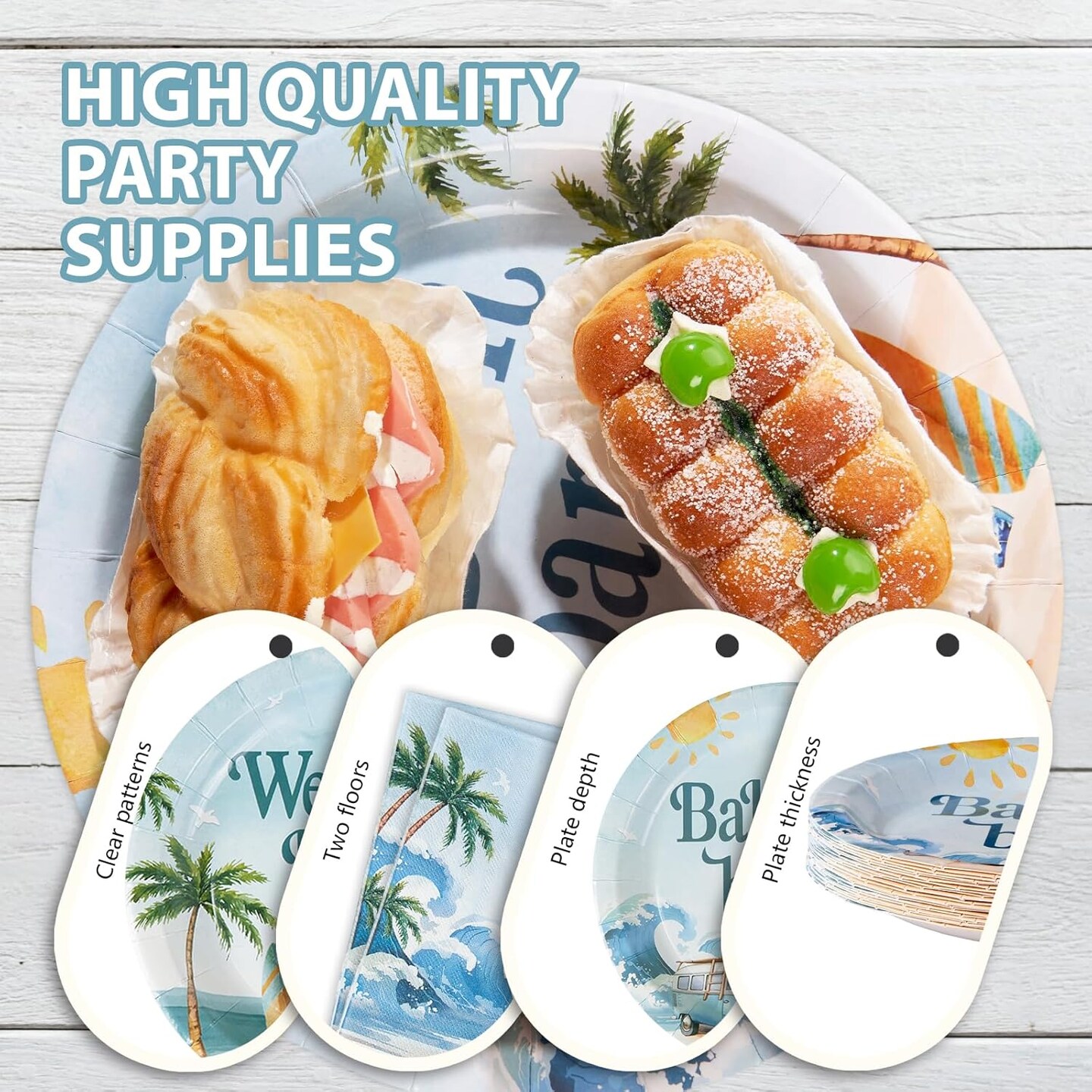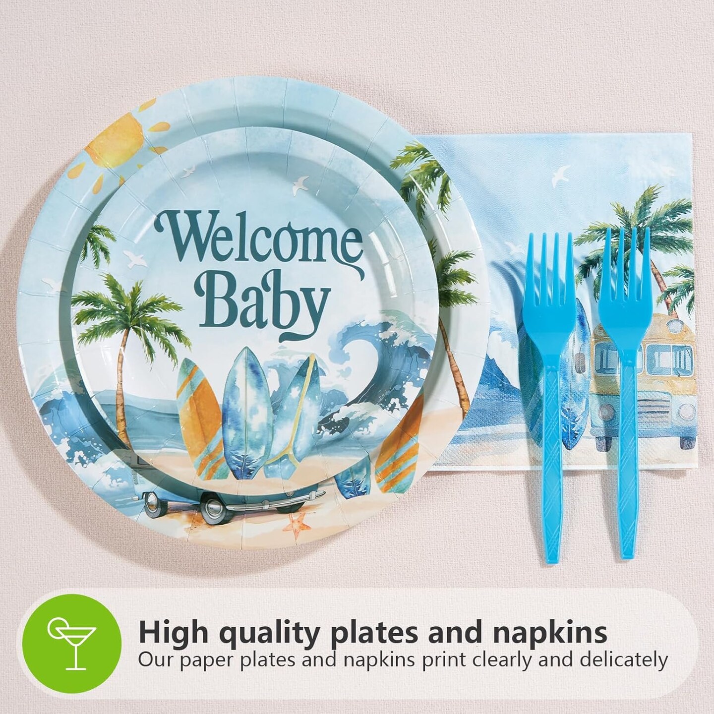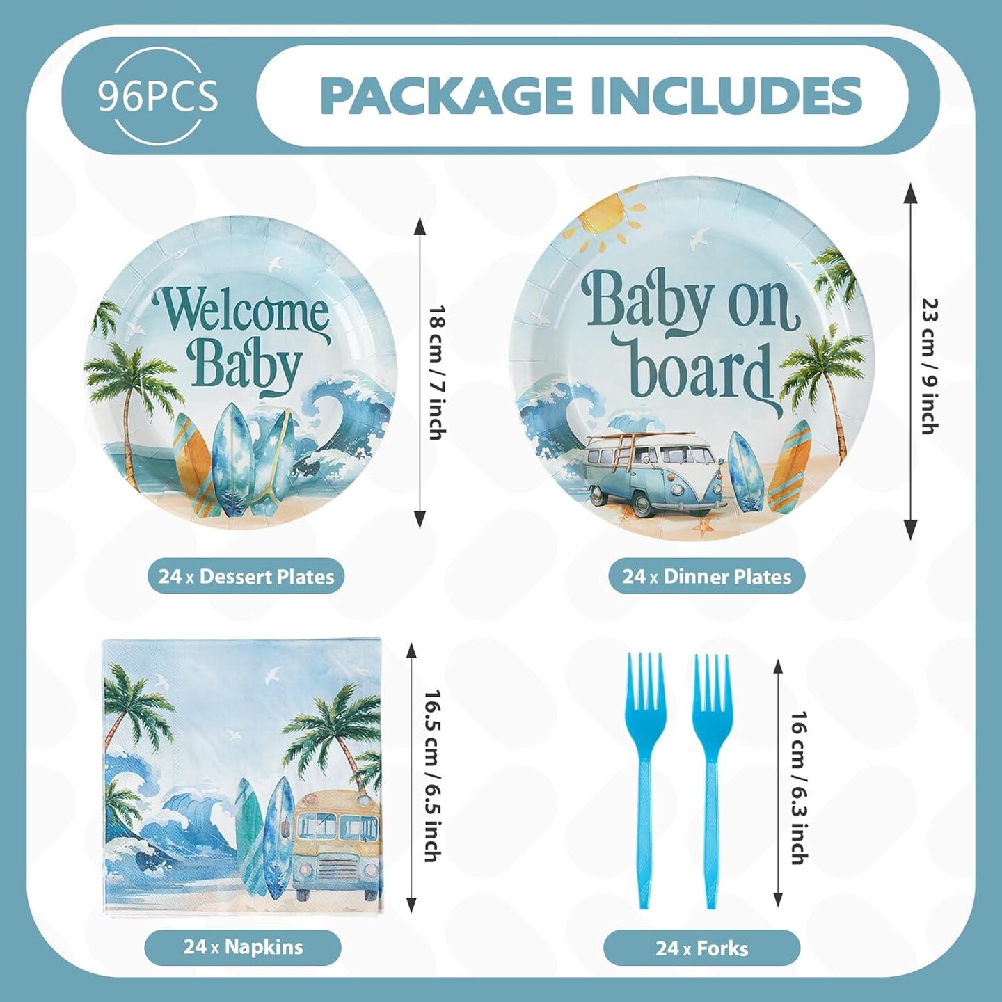 96 Pcs Surf Baby Shower Decorations Baby On Board Shower Plates and Napkins Disposable Surfboard Tableware Set(Blue)