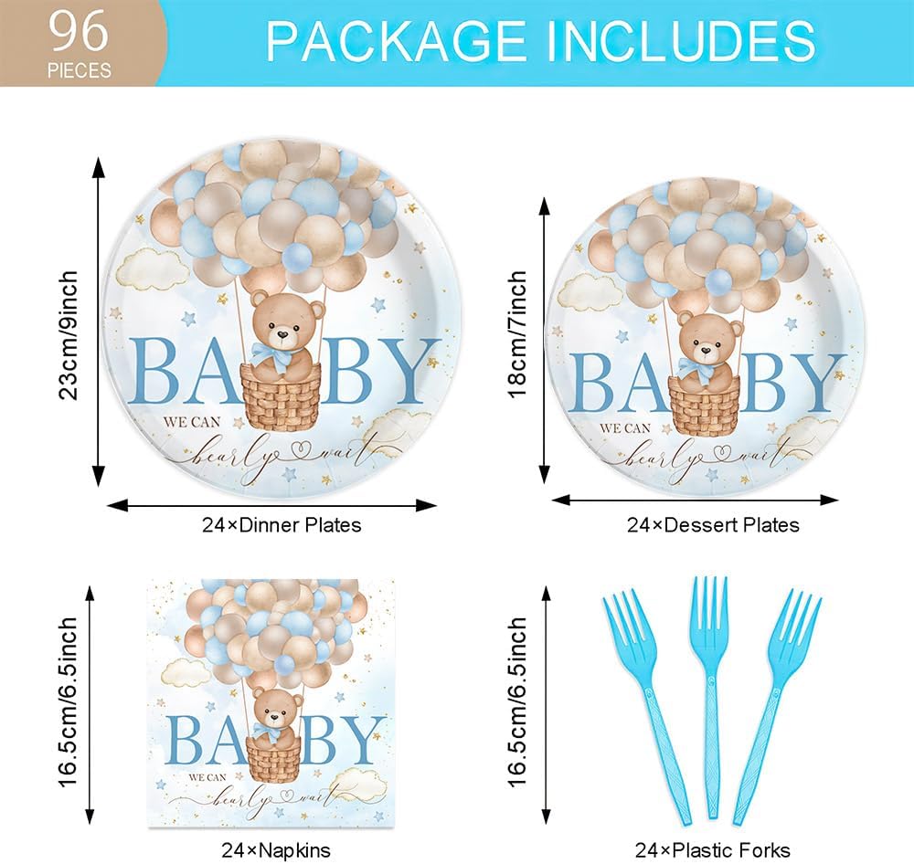 96Pcs Bear Baby Shower Tableware Sets - Serves 24 Guests (Blue)