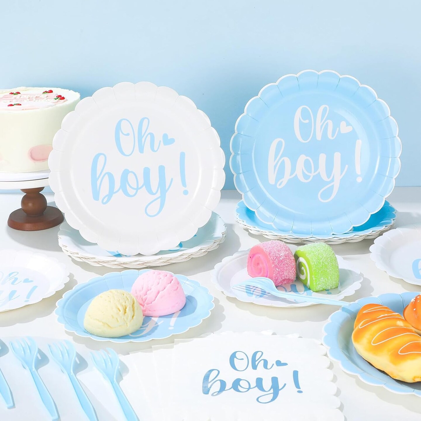 96PCS Oh Boy Baby Shower Decorations Blue Foil Scalloped Paper Plates Napkins