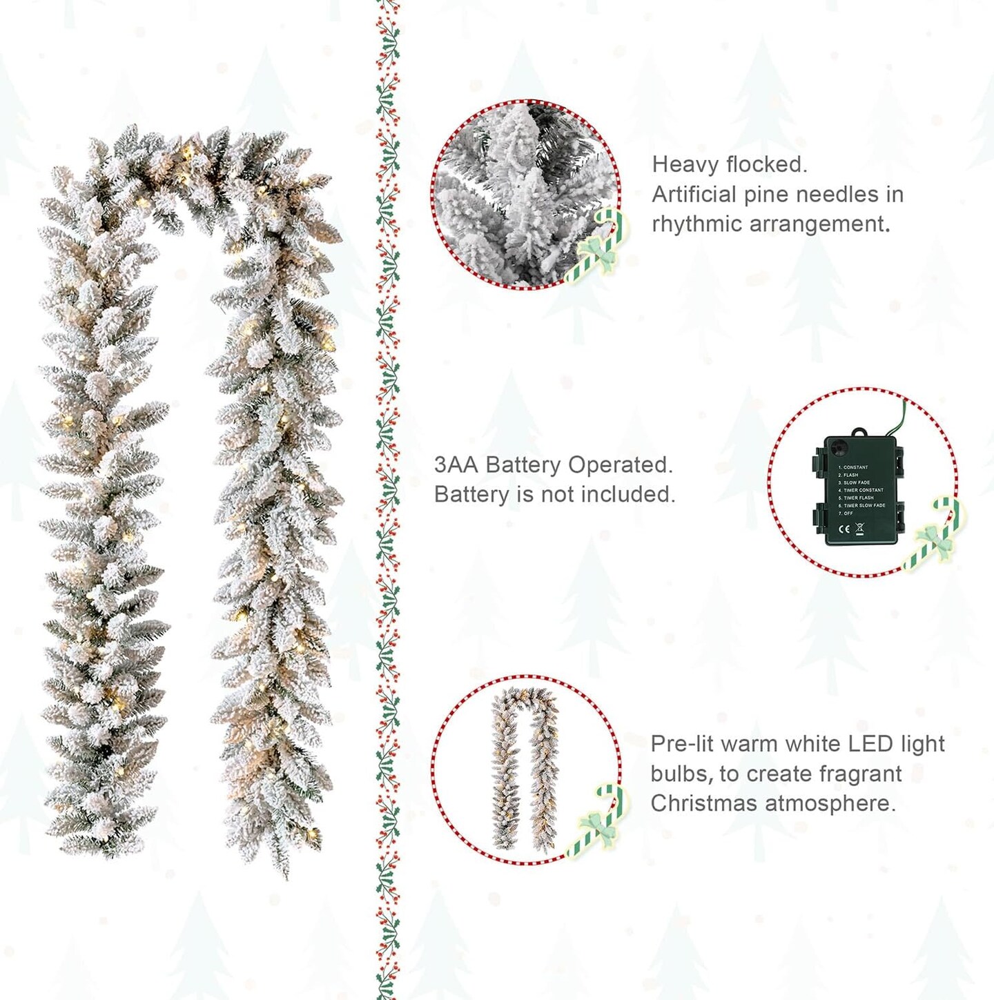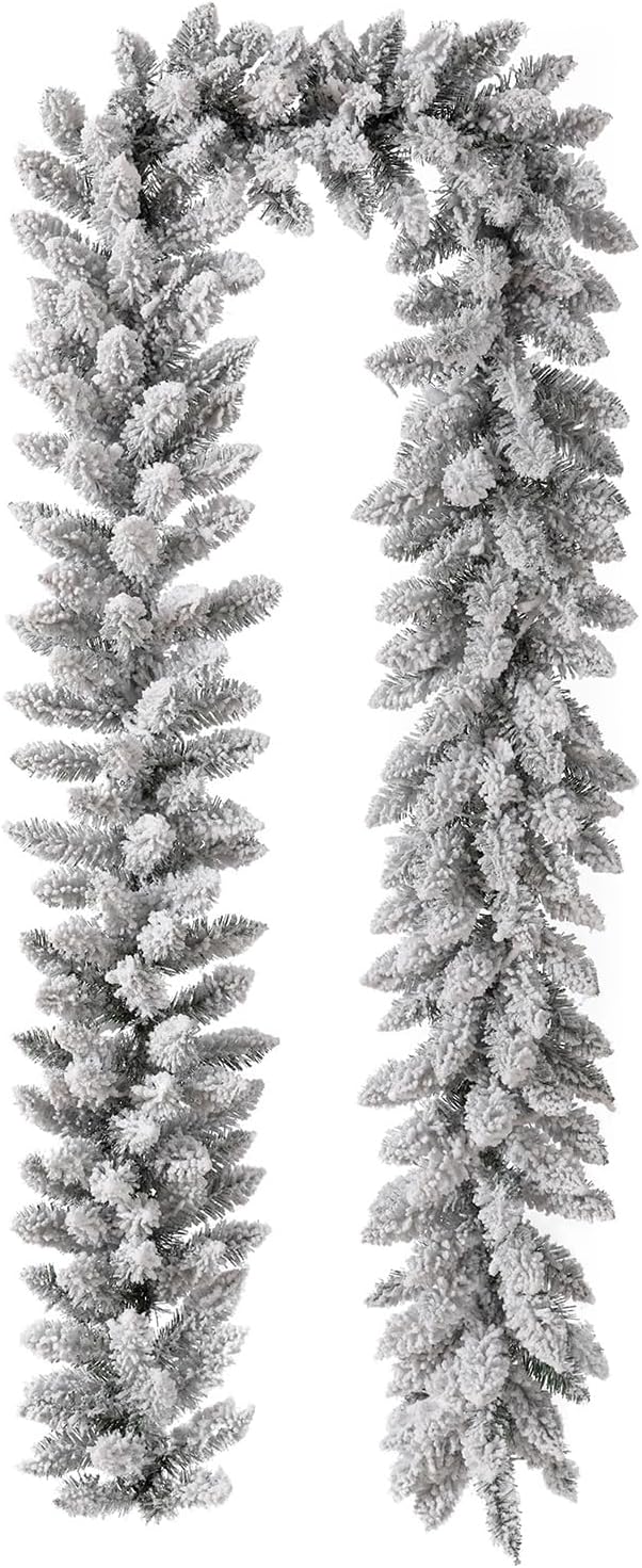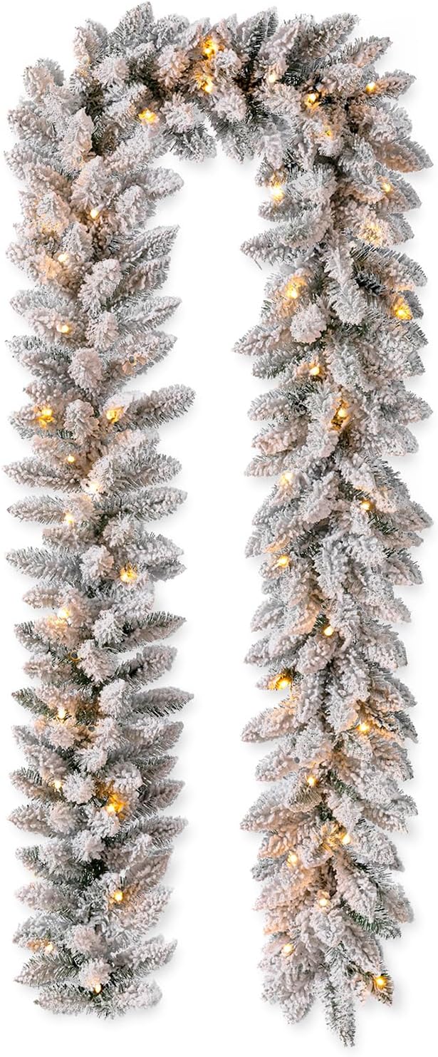 9ft Pre-Lit Snow Flocked Christmas Garland and Warm White LED Lights with Timer