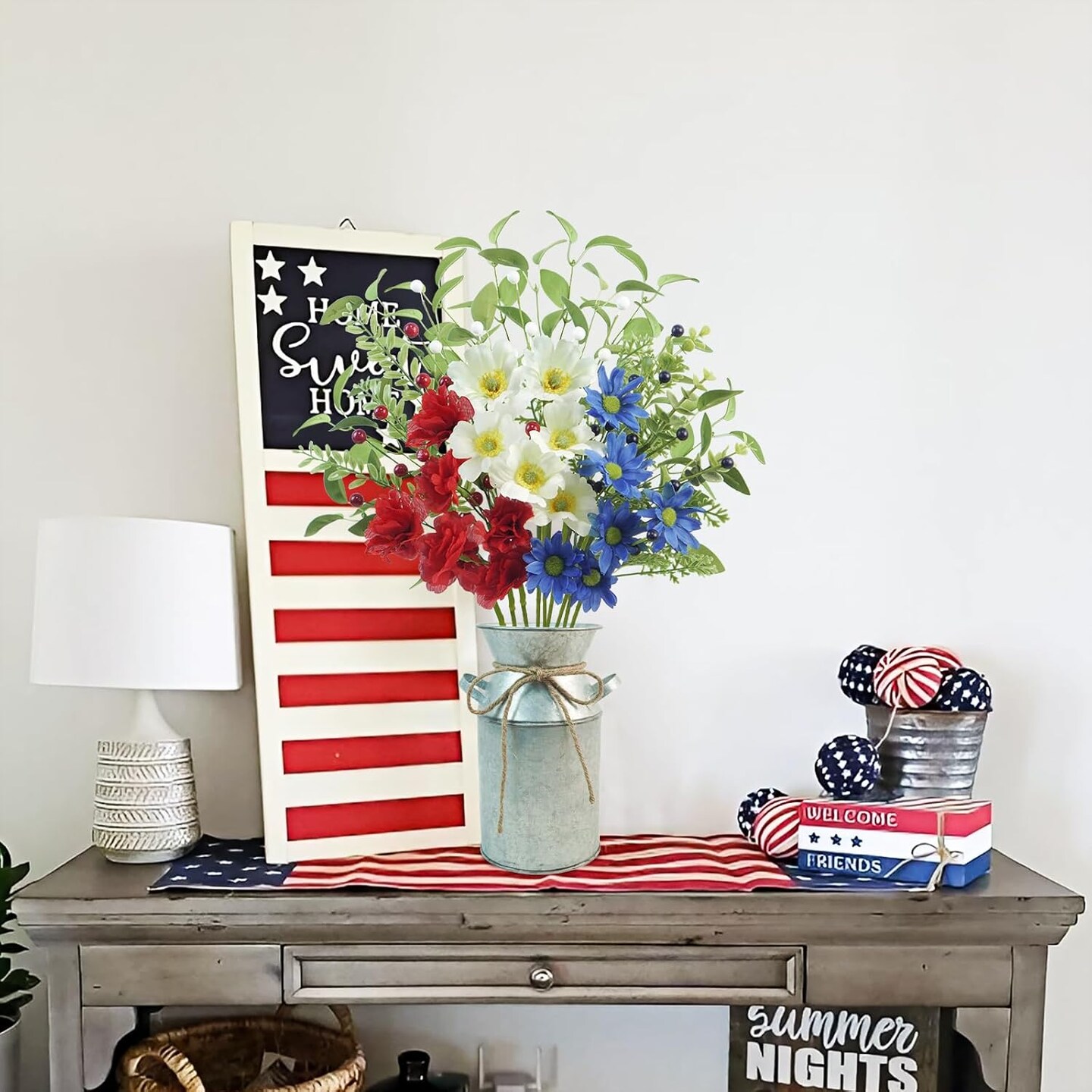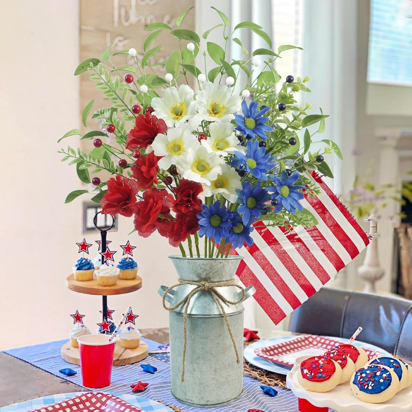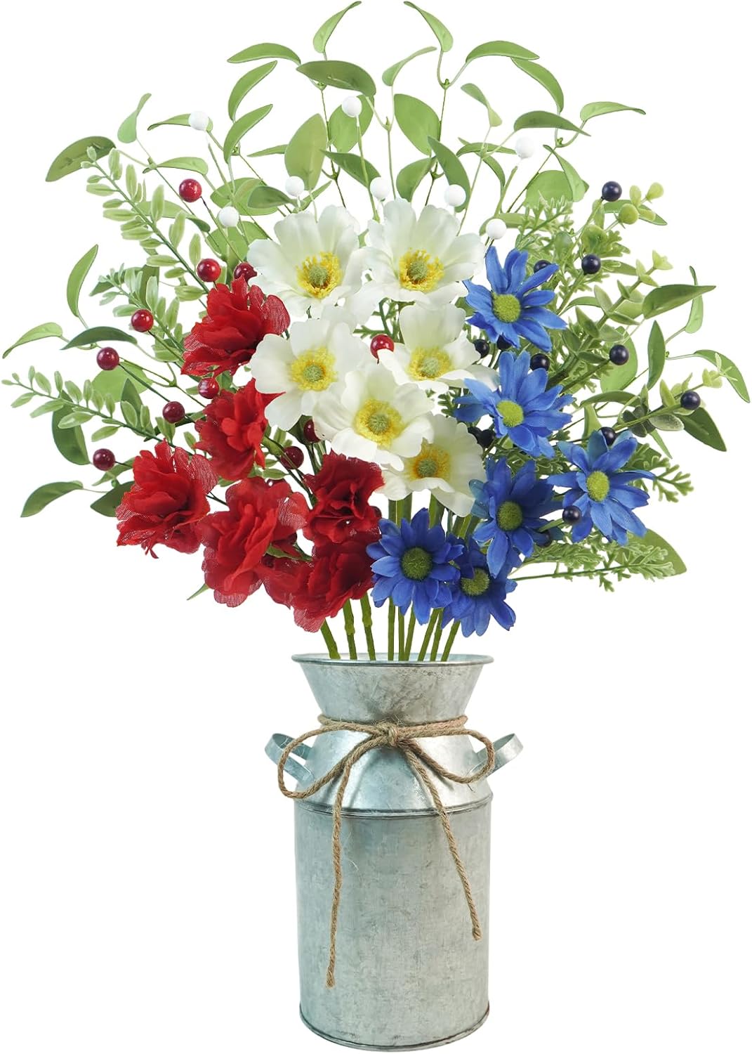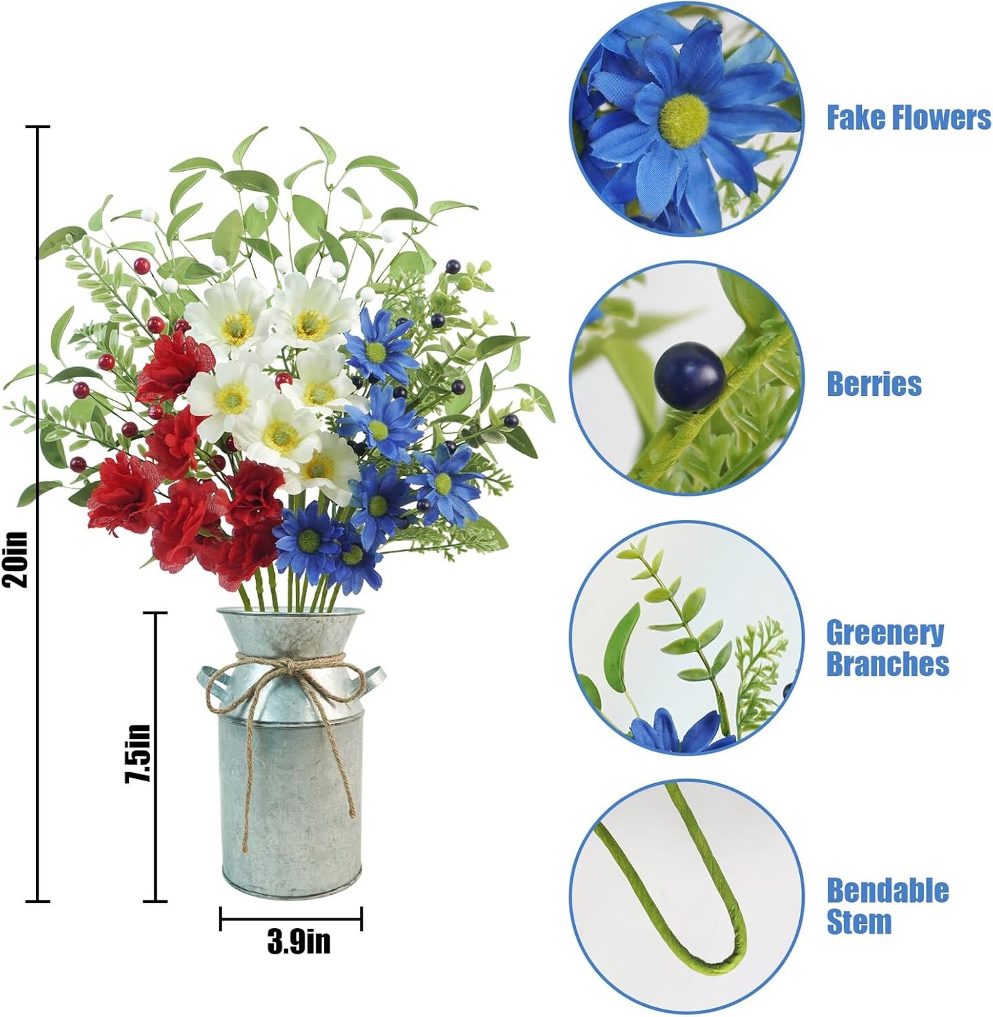 9pcs Patriotic Artificial Flowers, Red White and Blue Flowers with Vase for 4th of July Decorations Patriotic