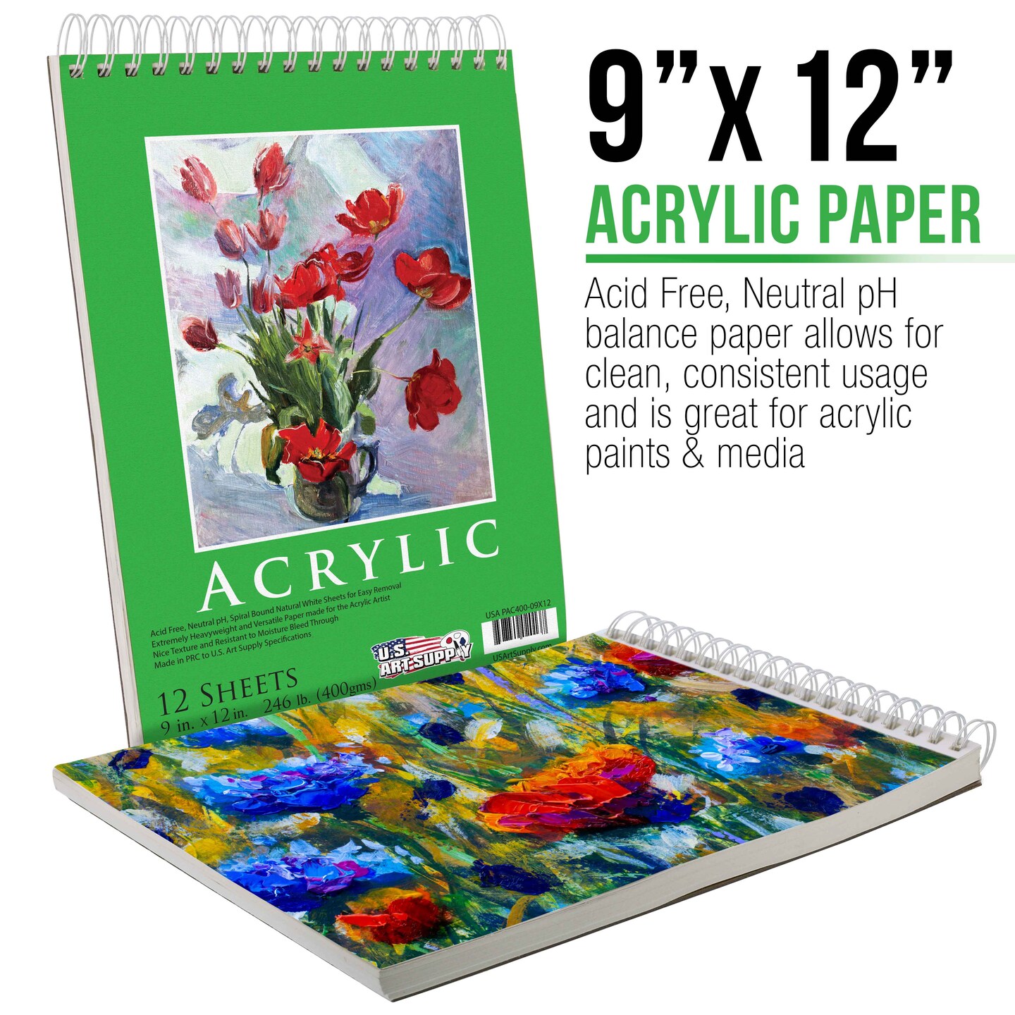9x12" Premium Heavy-Weight Acrylic Painting Paper Pad, 246lb (400gsm), 2 Pack, 12 Sheets, Spiral Bound, for Acrylic Paint