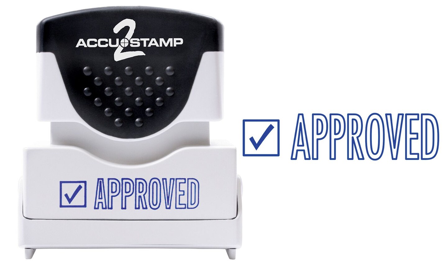 ACCUSTAMP2 Message Stamp, 1-color, Pre-inked, APPROVED, 1-5/8" x 1/2" impression size, Blue Message and Symbol