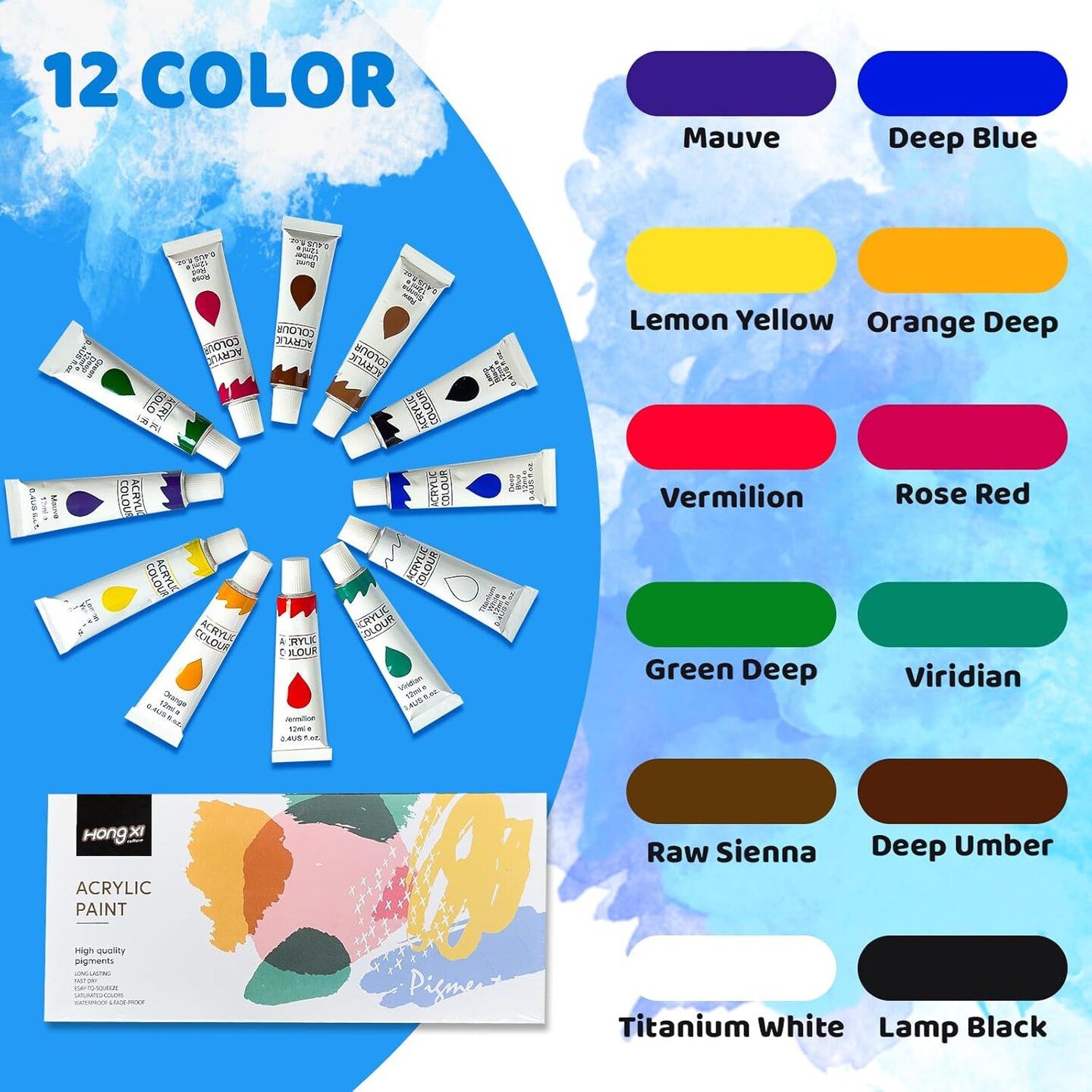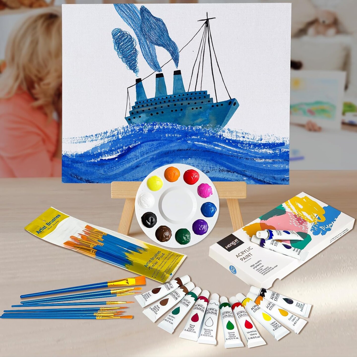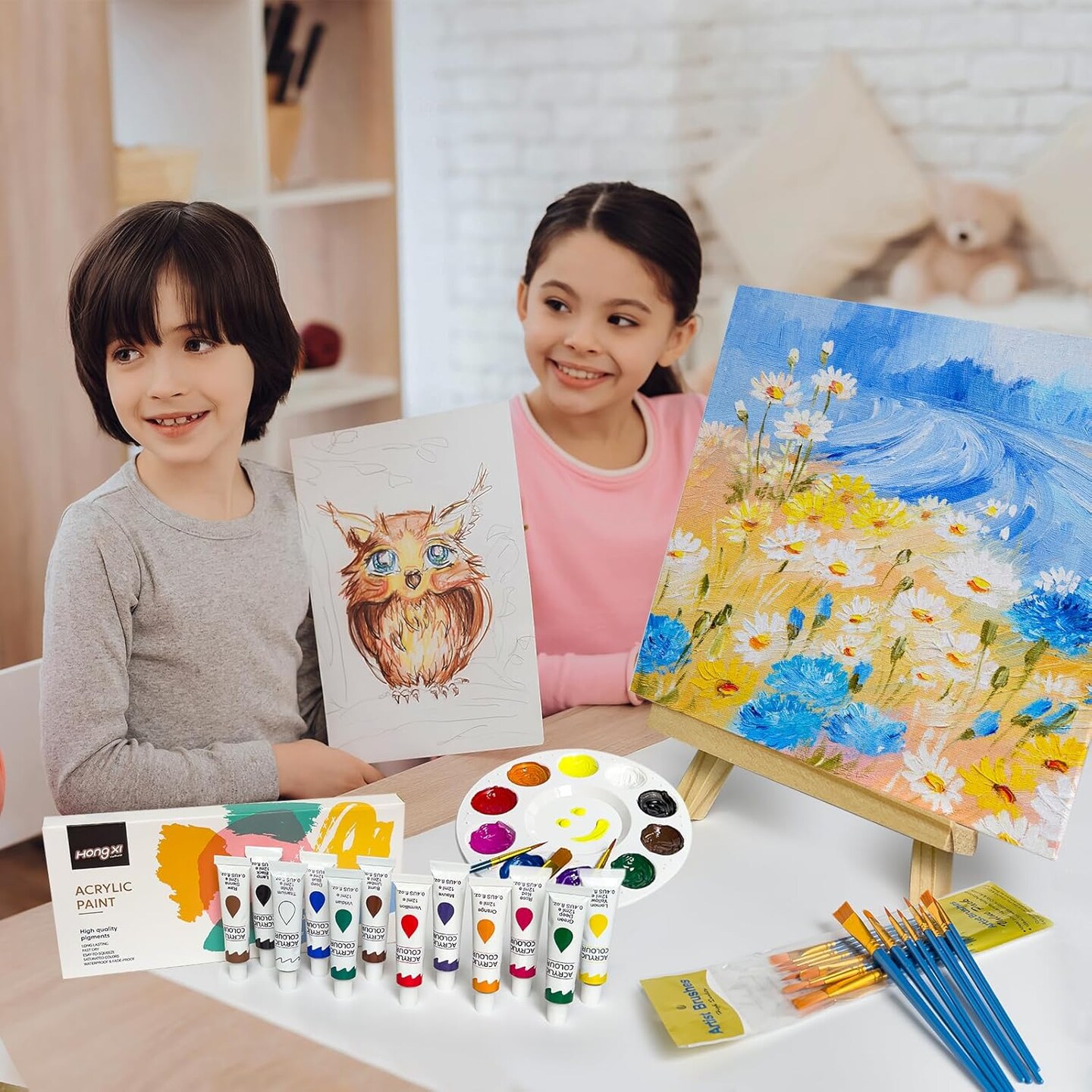 Acrylic Paint Canvas Set, Acrylic Painting Kit with 2 Pack of 12 Colors Acrylic Paint, 2 Sets of Wooden Easels, 6 Canvas, 20 Brushes & 2 Palettes, Art Painting Supplies Valentines Day Gift