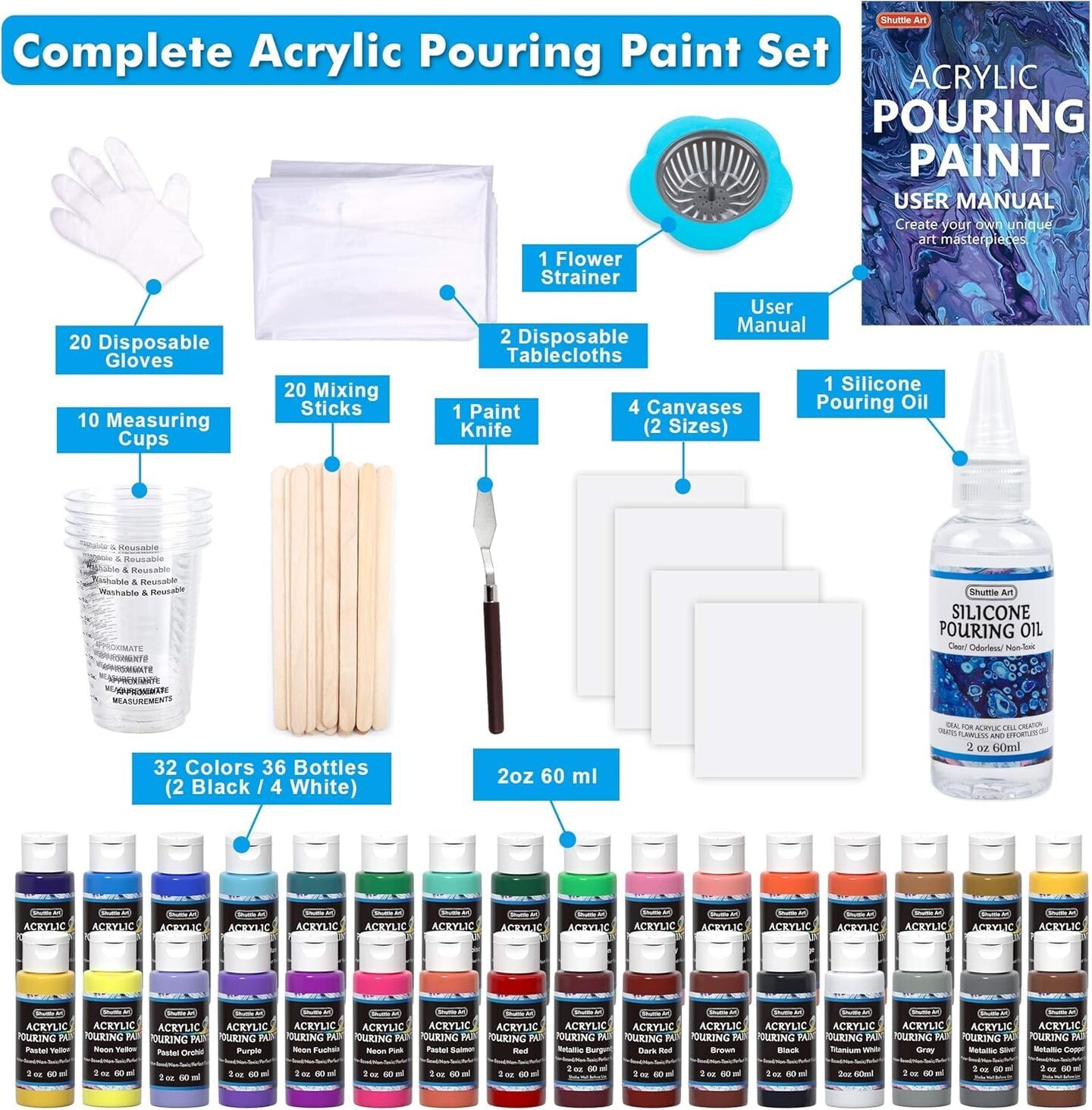 Acrylic Pouring Paint, Set of 36 Bottles (2 oz/60ml) Pre-Mixed High-Flow Pouring Supplies