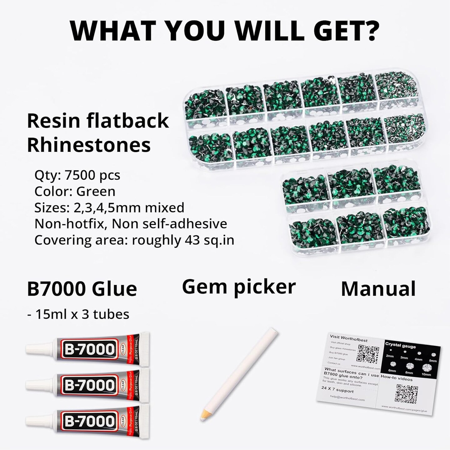 Adhesive Glue for 7,500pcs Emerald Green Rhinestones – Mixed 2/3/4/5mm Flatback Gems for DIY Crafts, Clothing, Fabric, Football, and Bedazzling Projects