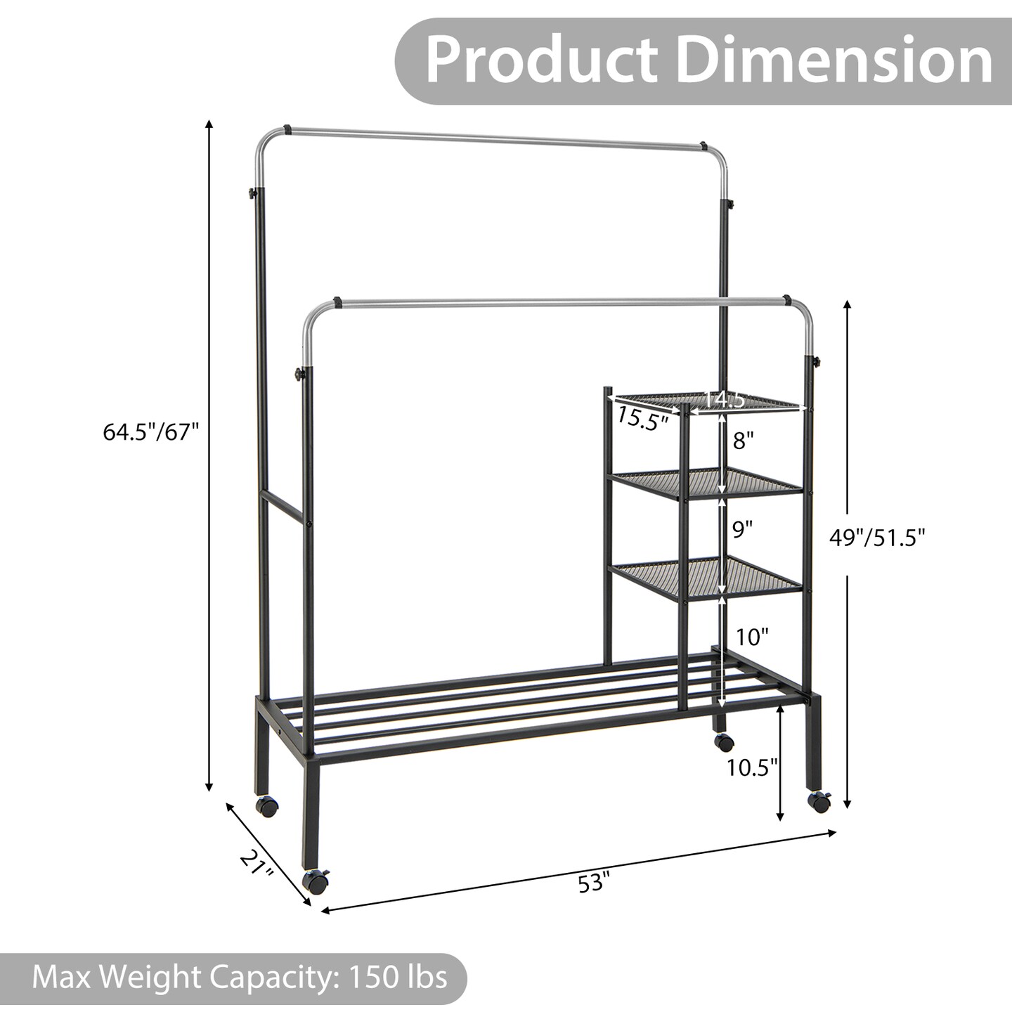 Adjustable Double Rod Clothes Drying Rack with 3-Tier Mesh Shelf Heavy Duty Steel Frame