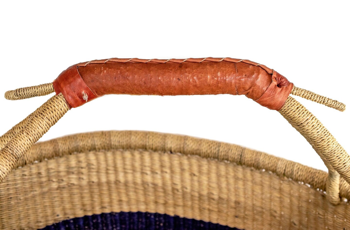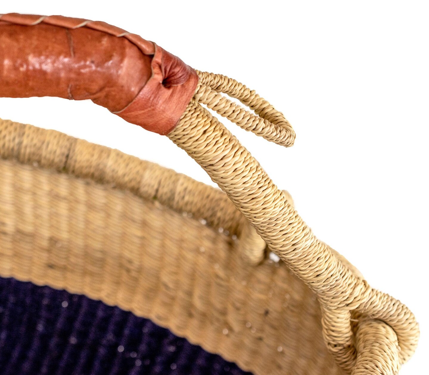 African Bolga Basket | Genuine Leather Handle | Woven Handmade Fair Trade Product | 100% Authentic Ghanaian | 16-18 Inches Across | Indigo Blue - Striped | The Bead Chest