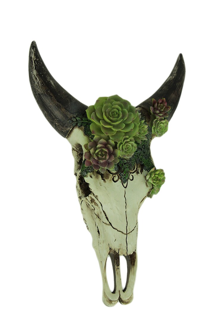 Aged Bull Skull with Succulent Plants Hanging Statue