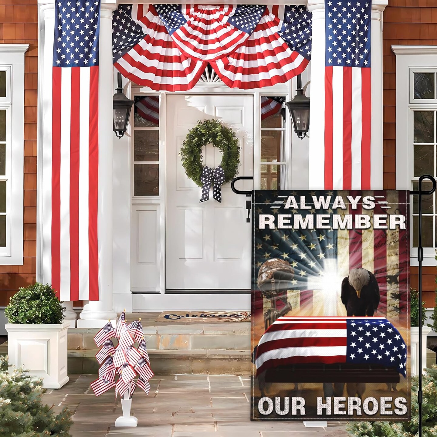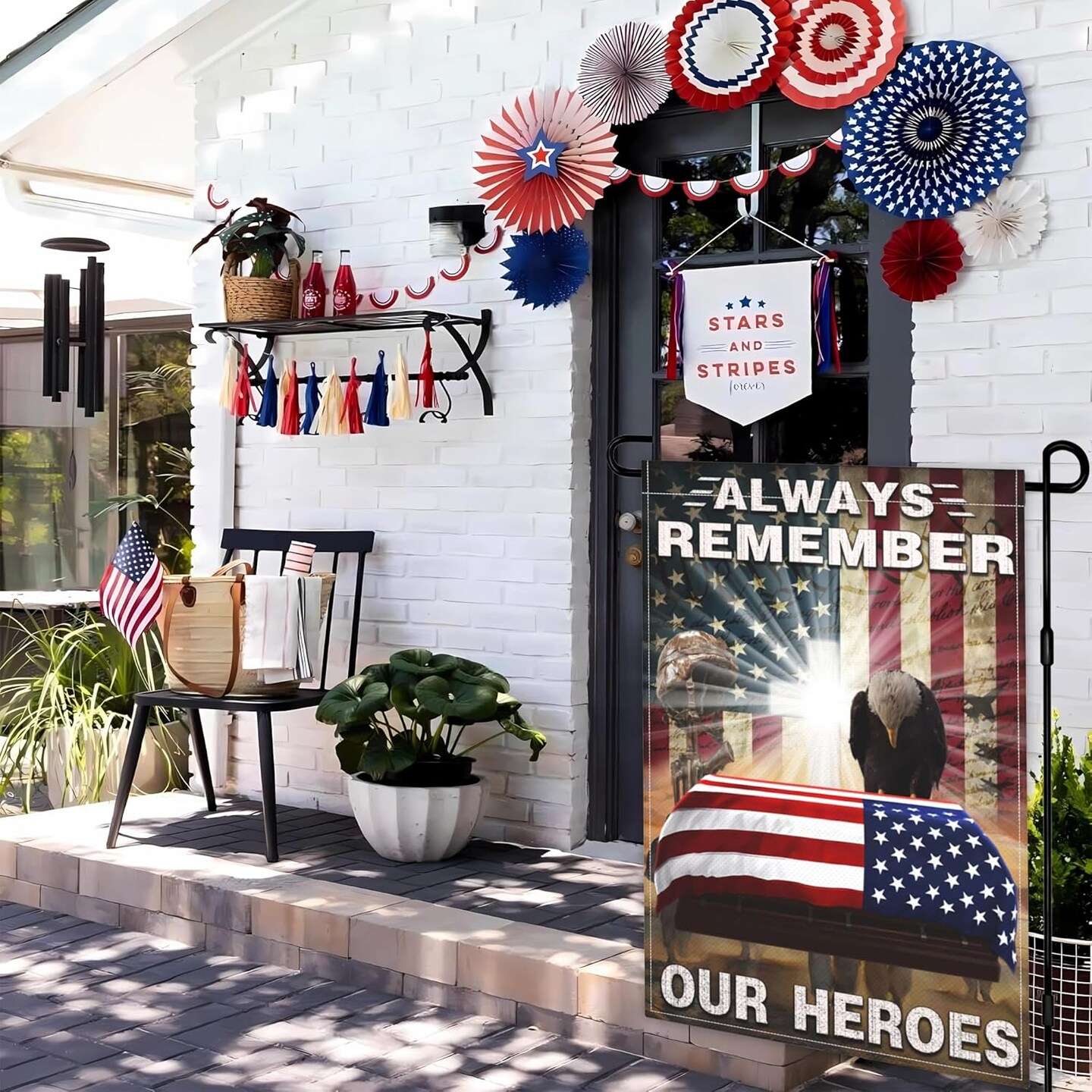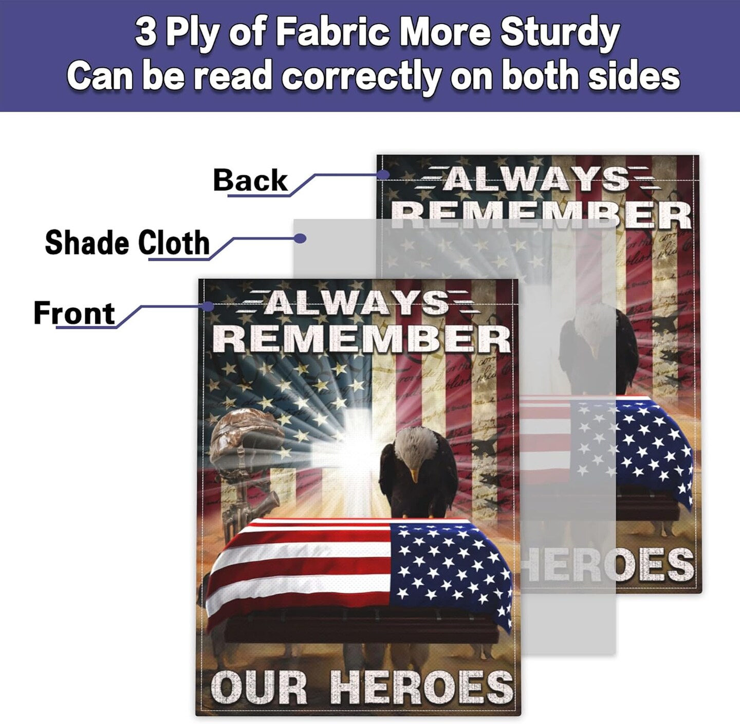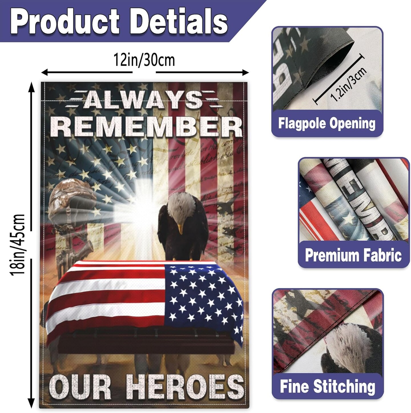 Always Remember Our Heroes Garden Flag 12x18 Inch Memorial Day Garden Flag 3ply Polyester Double Sided Print 4th of July Independence Day Veterans Day Garden Flags for House Indoor Yard Outdoor Holiday Patriotic Decor