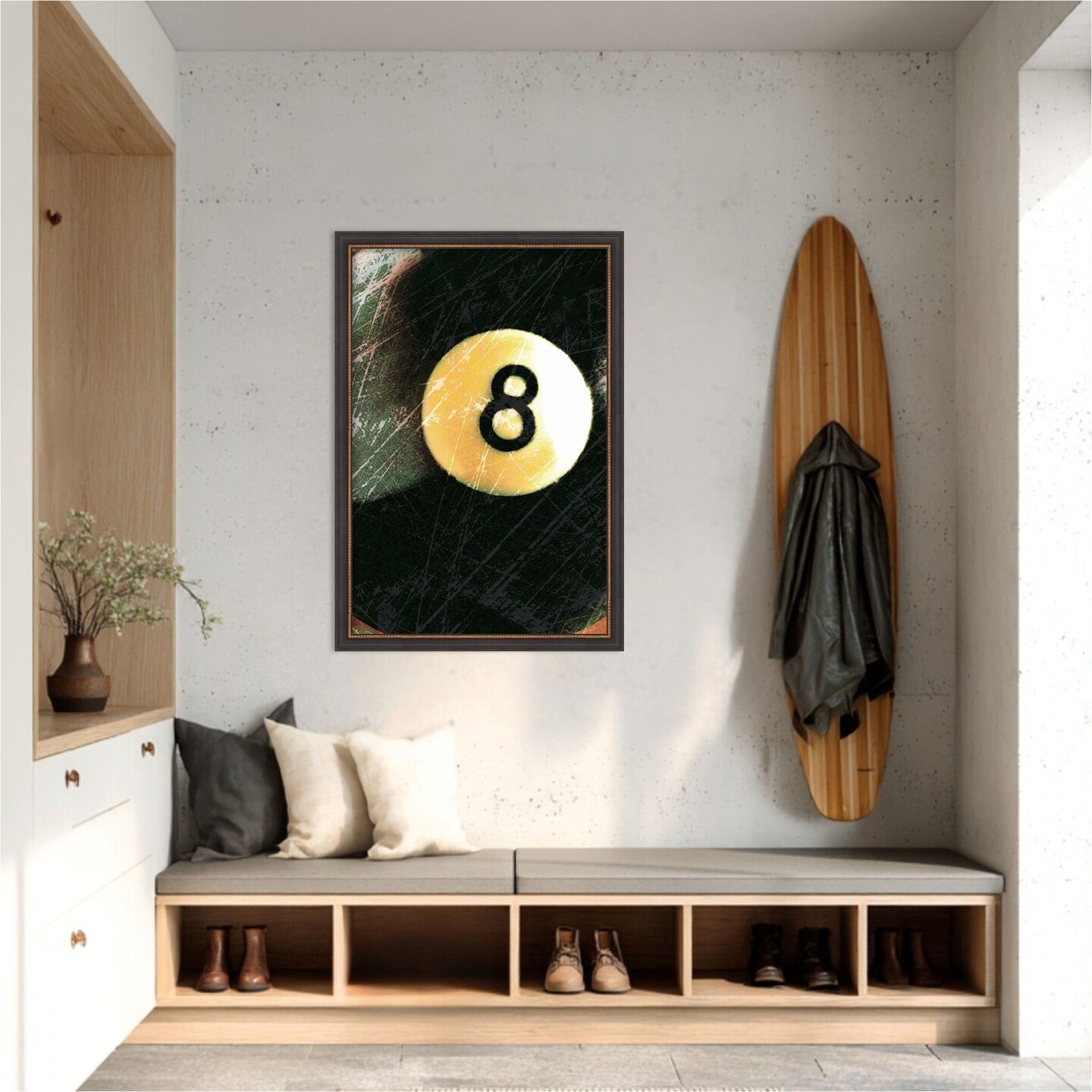 Amanti Art Framed Fabric Pinboard Behind The 8 Ball Printed Bulletin Board for Use as a Vision Board or Wall Organization