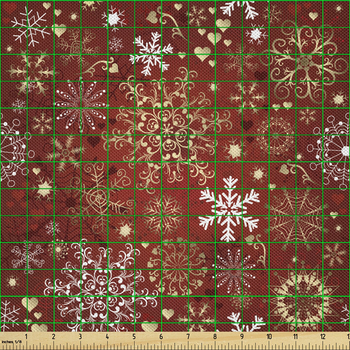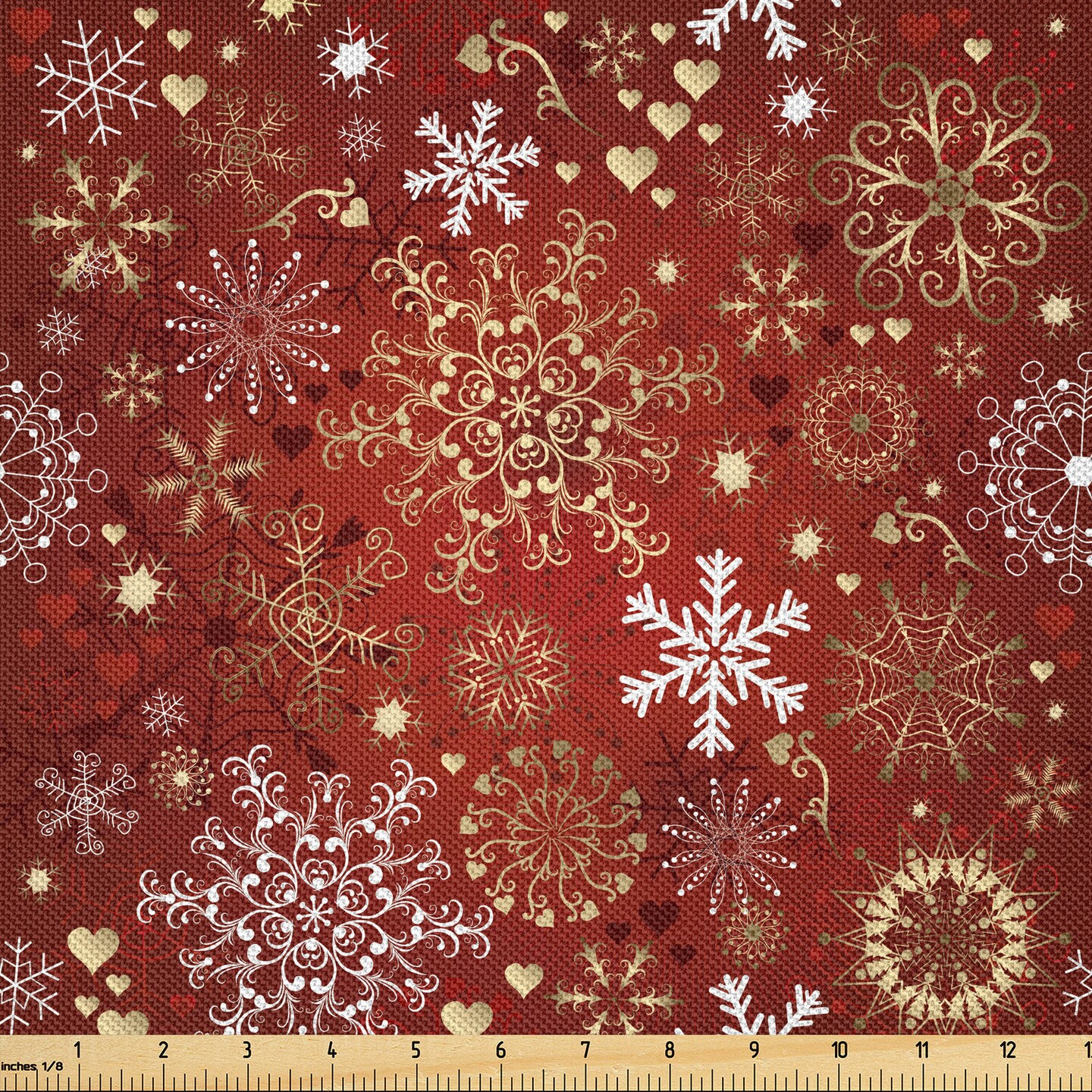 Ambesonne Christmas Fabric by The Yard, Ornate Snowflakes with Floral Swirls and Vivid Hearts Pattern, Decorative Satin Fabric for Home Textiles and Crafts, 1 Yards, Red Yellow and White