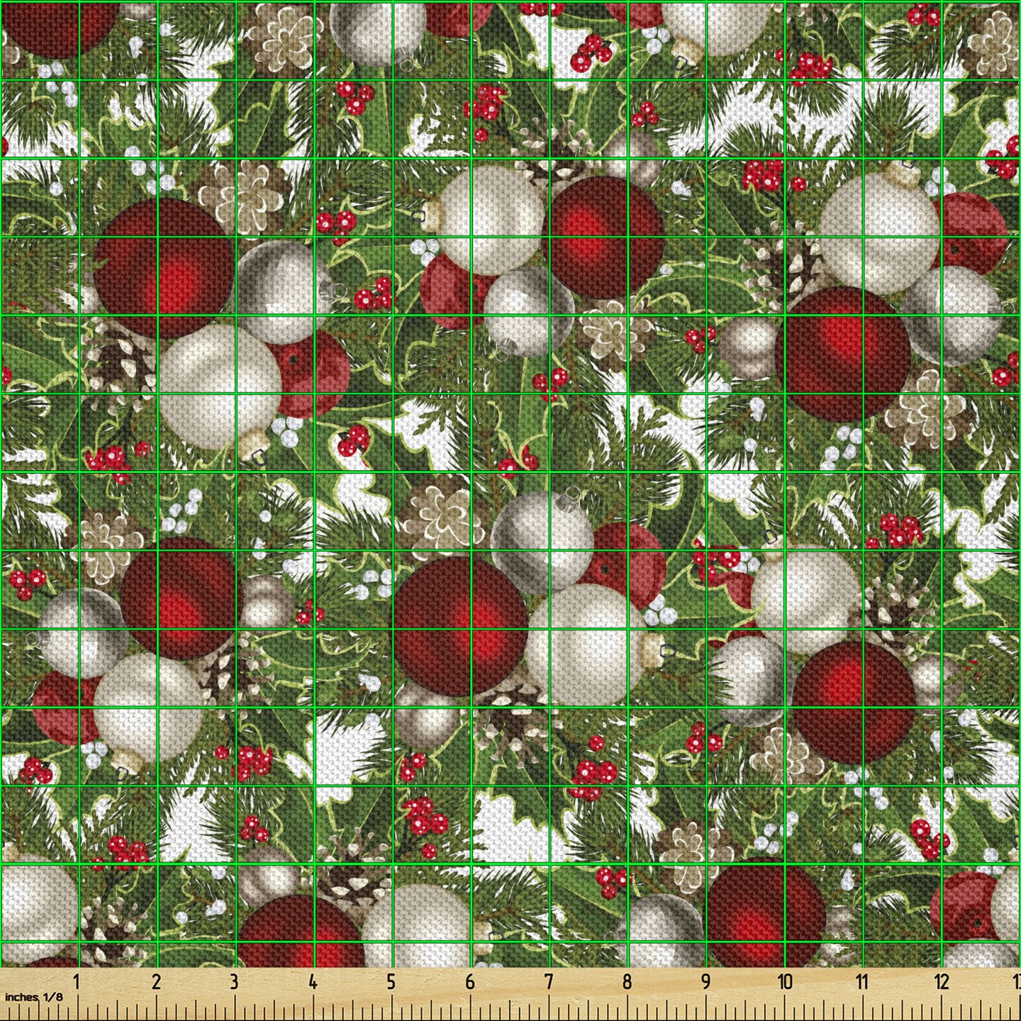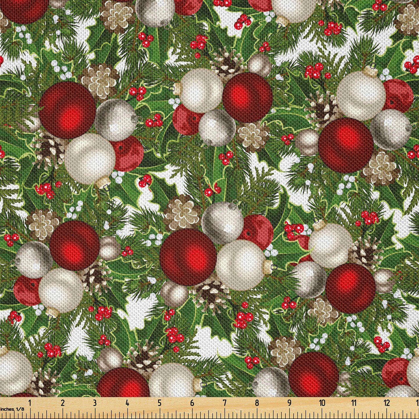Ambesonne Christmas Fabric by The Yard, Pine Fir Cones Balls and Coniferous Tree Leaves Holly Berry Old Fashioned, Decorative Satin Fabric for Home Textiles and Crafts, 2 Yards, Red Green Grey
