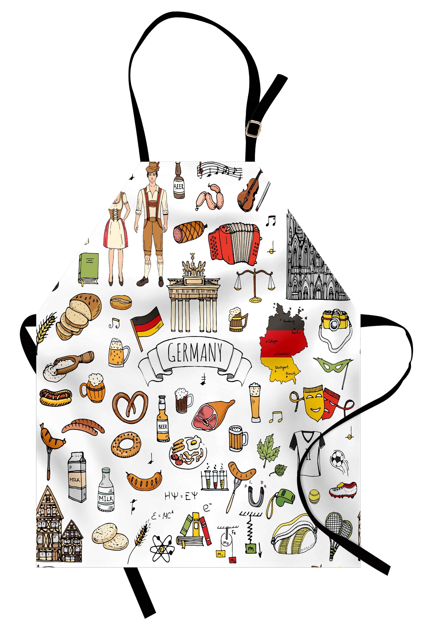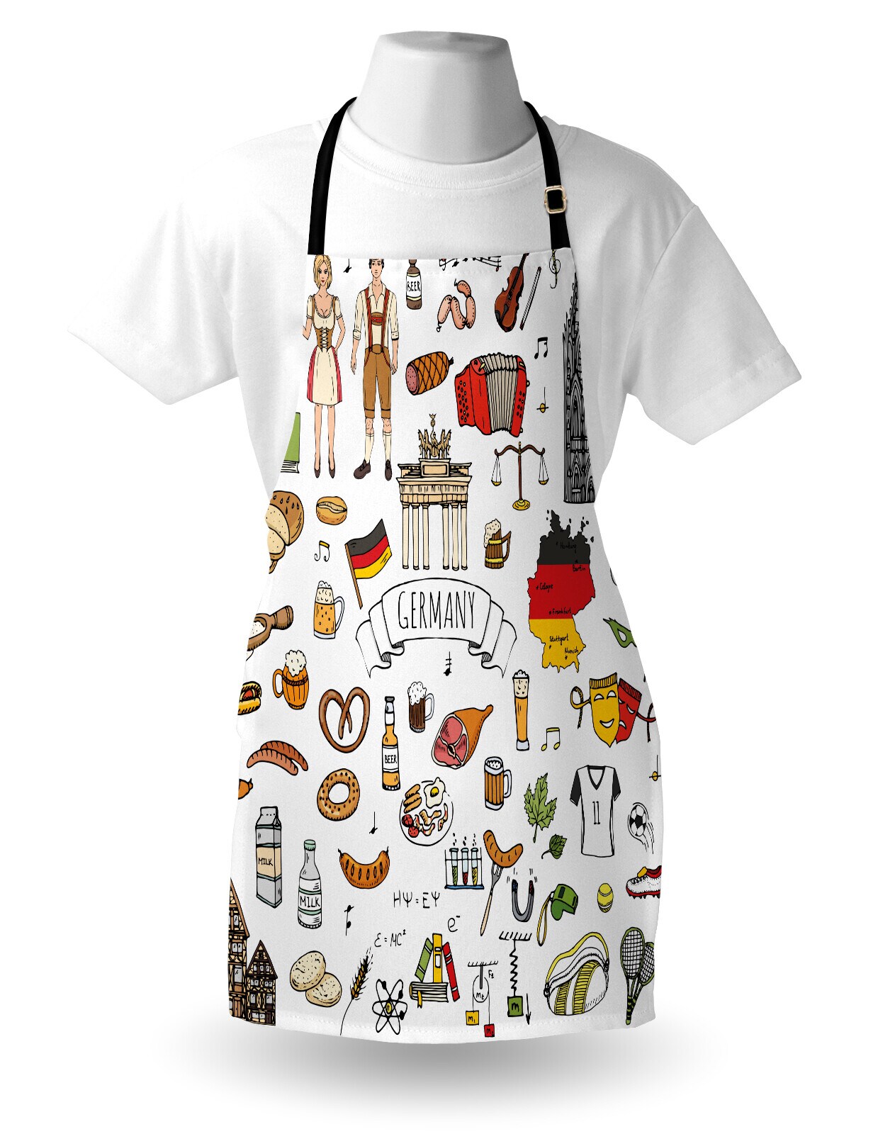 Ambesonne German Apron, Hand Drawn Doodle of German Culture Football Jersey Food Science and Music, Unisex Kitchen Bib with Adjustable Neck for Cooking Gardening, Adult Size, Multicolor