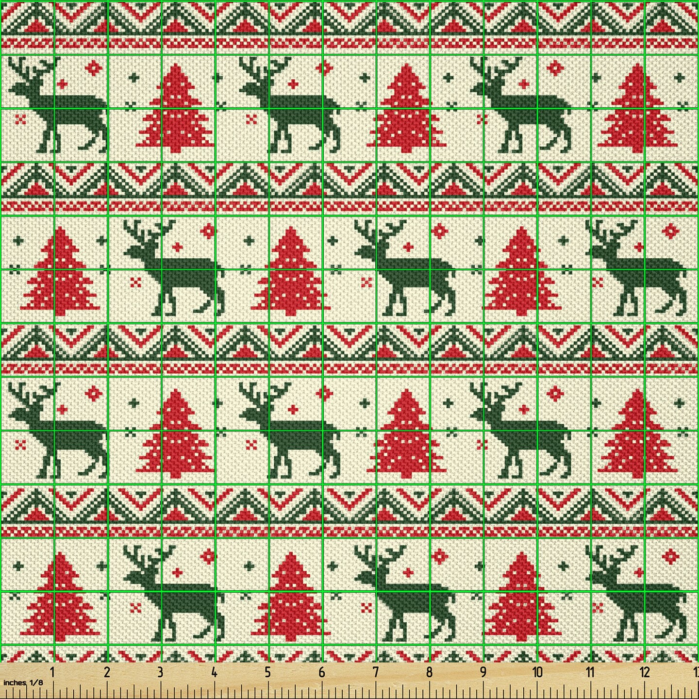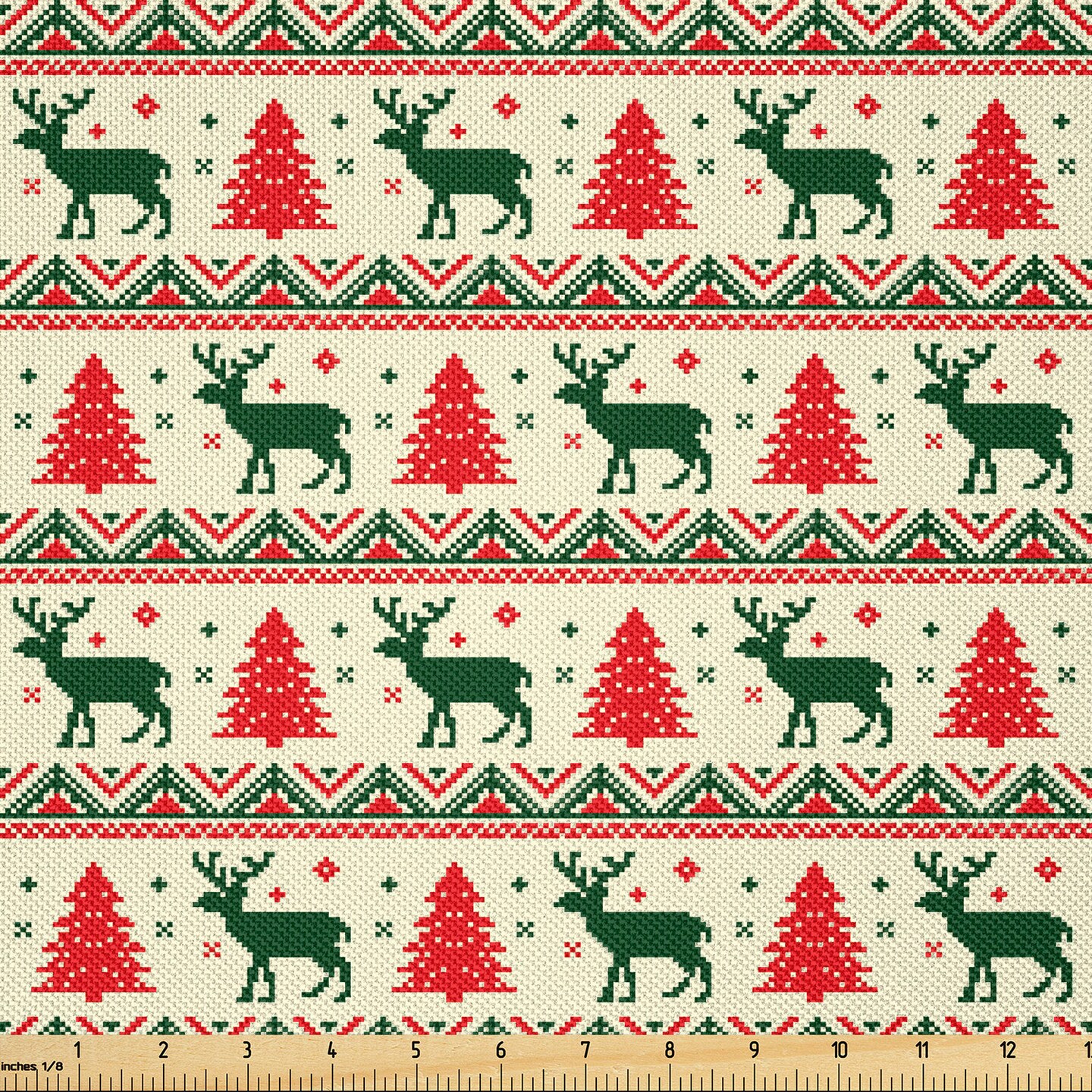Ambesonne Nordic Fabric by The Yard, Pixel Art Inspirations Christmas Ornamental December Reindeers Vintage, Decorative Satin Fabric for Home Textiles and Crafts, 1 Yards, Emerald Beige Scarlet