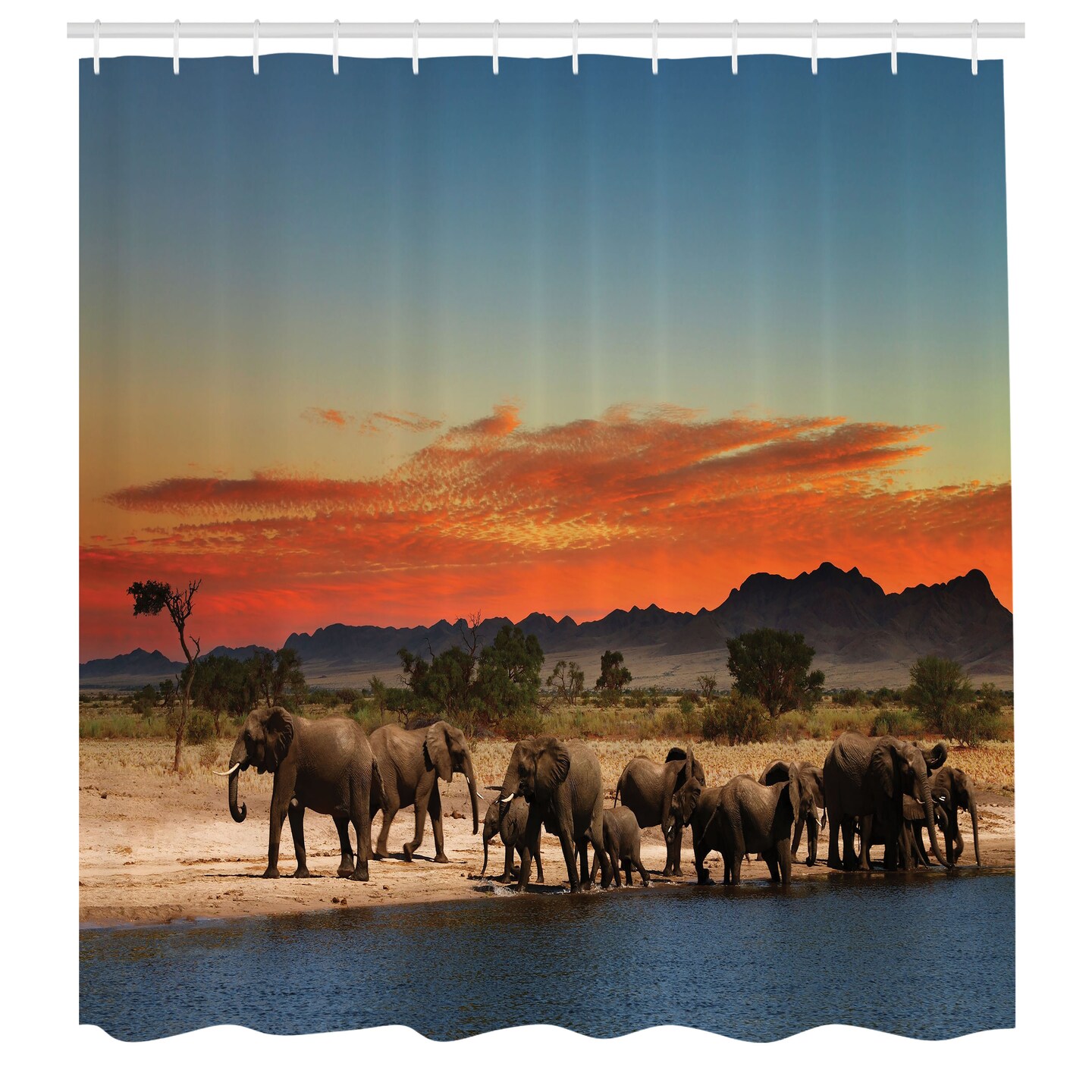 Ambesonne Savannah Shower Curtain, Animal Herd Watering in Wilderness at Sunset Africa Image Print, Cloth Fabric Bathroom Decor Set with Hooks, 69" W x 70" L, Pale Blue Orange Brown