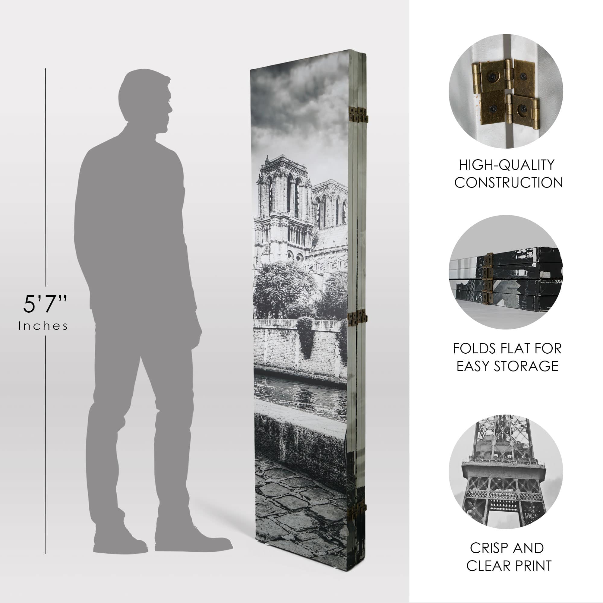 American Art Decor™ 6ft. Double-Sided 4-Panel Black and White Eiffel Tower & Notre Dame Bike Canvas Room Divider