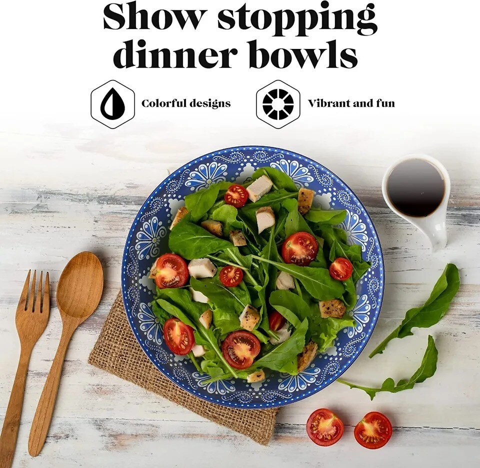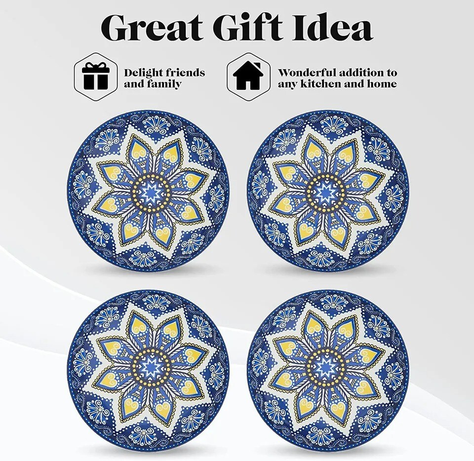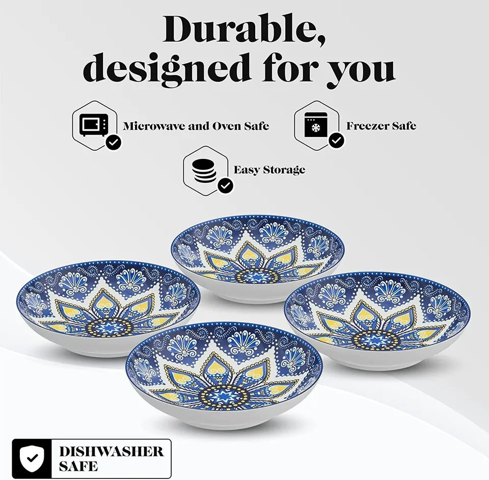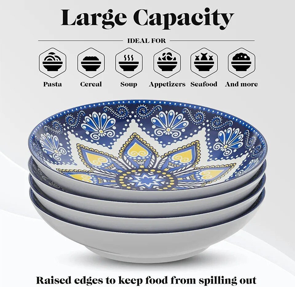 American Atelier Pasta Bowls | Set of 4 Large, 9-inch - Blue & Yellow Medallion