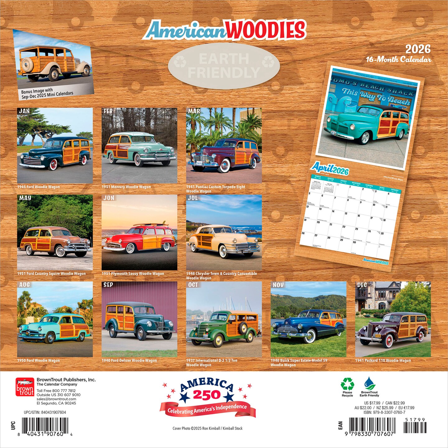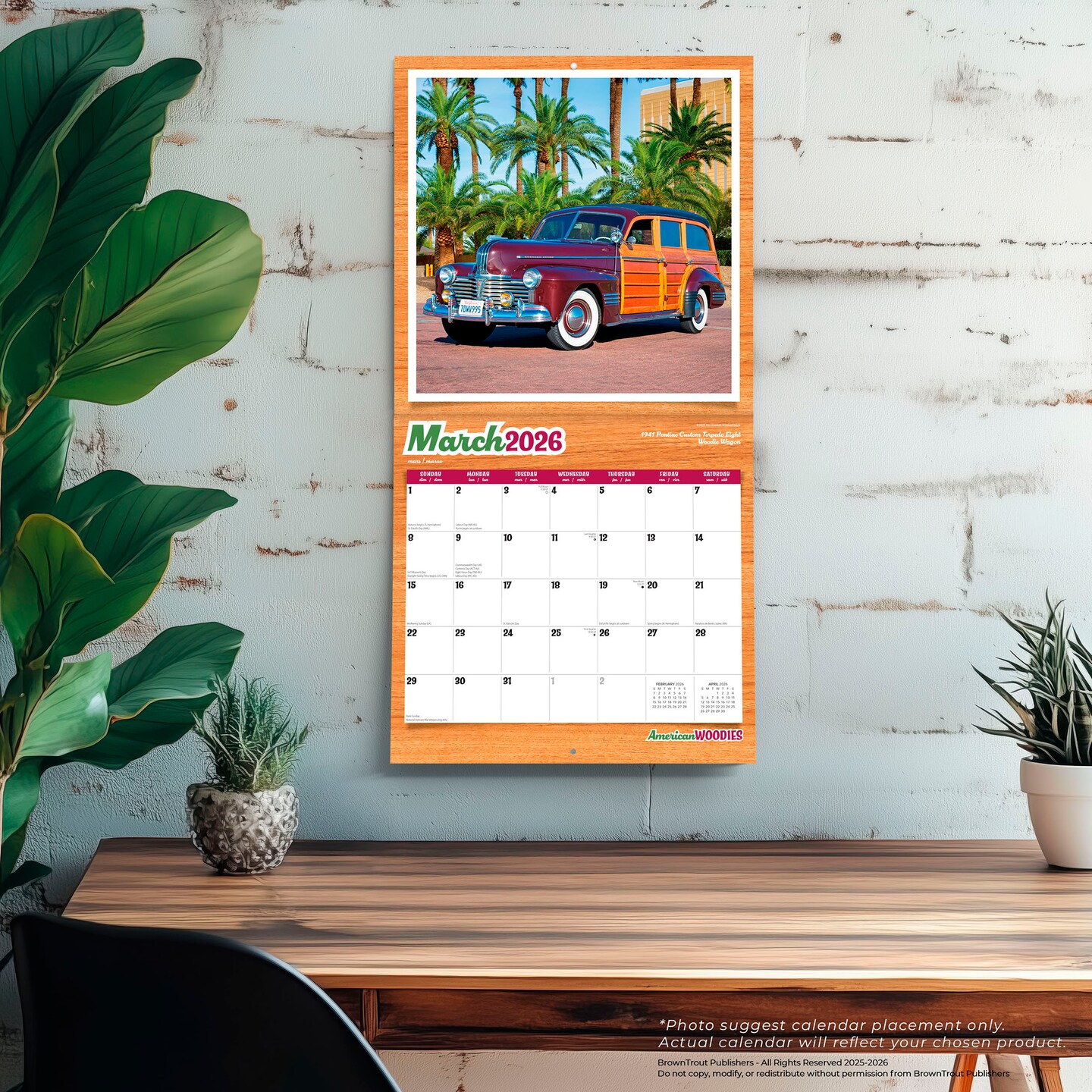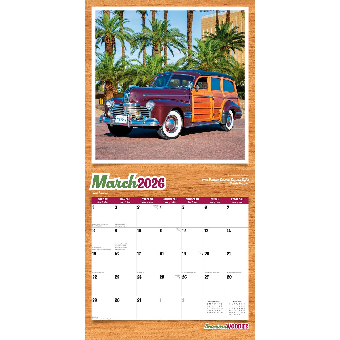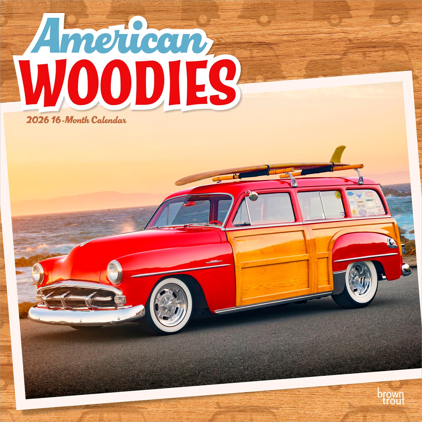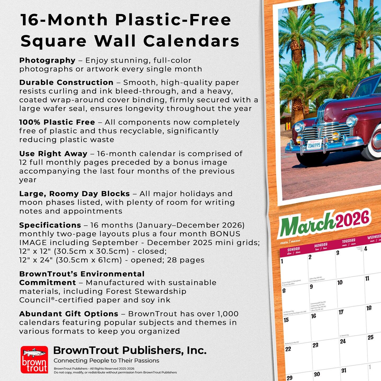 American Woodies | 2026 12 x 24 Inch (Hanging) Monthly Square Wall Calendar | Plastic-Free | Motor Club | Automobiles Truck Classic
