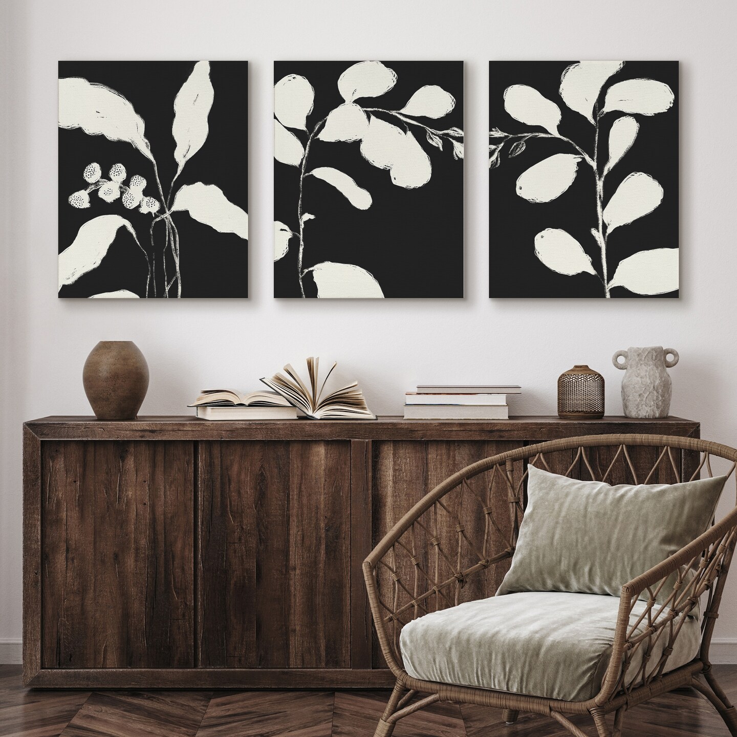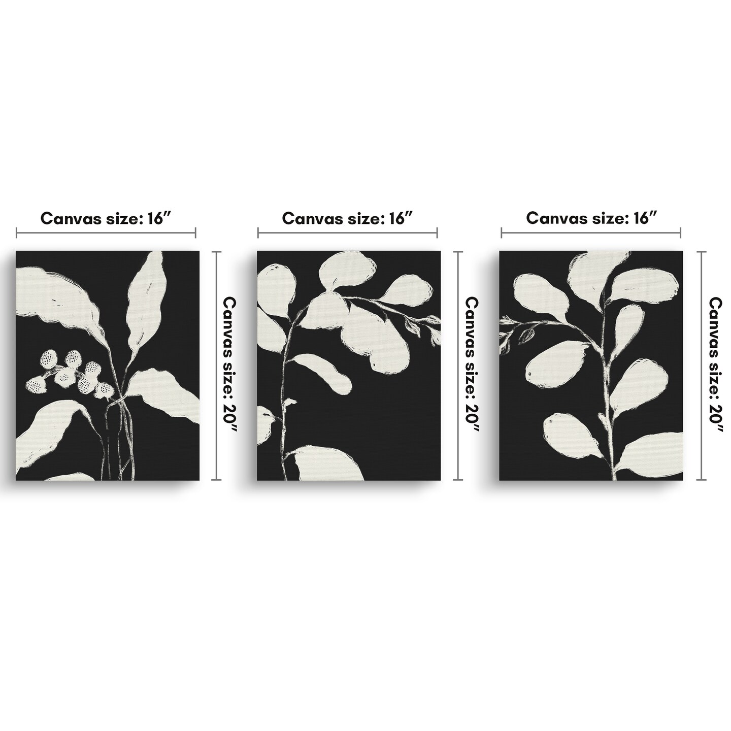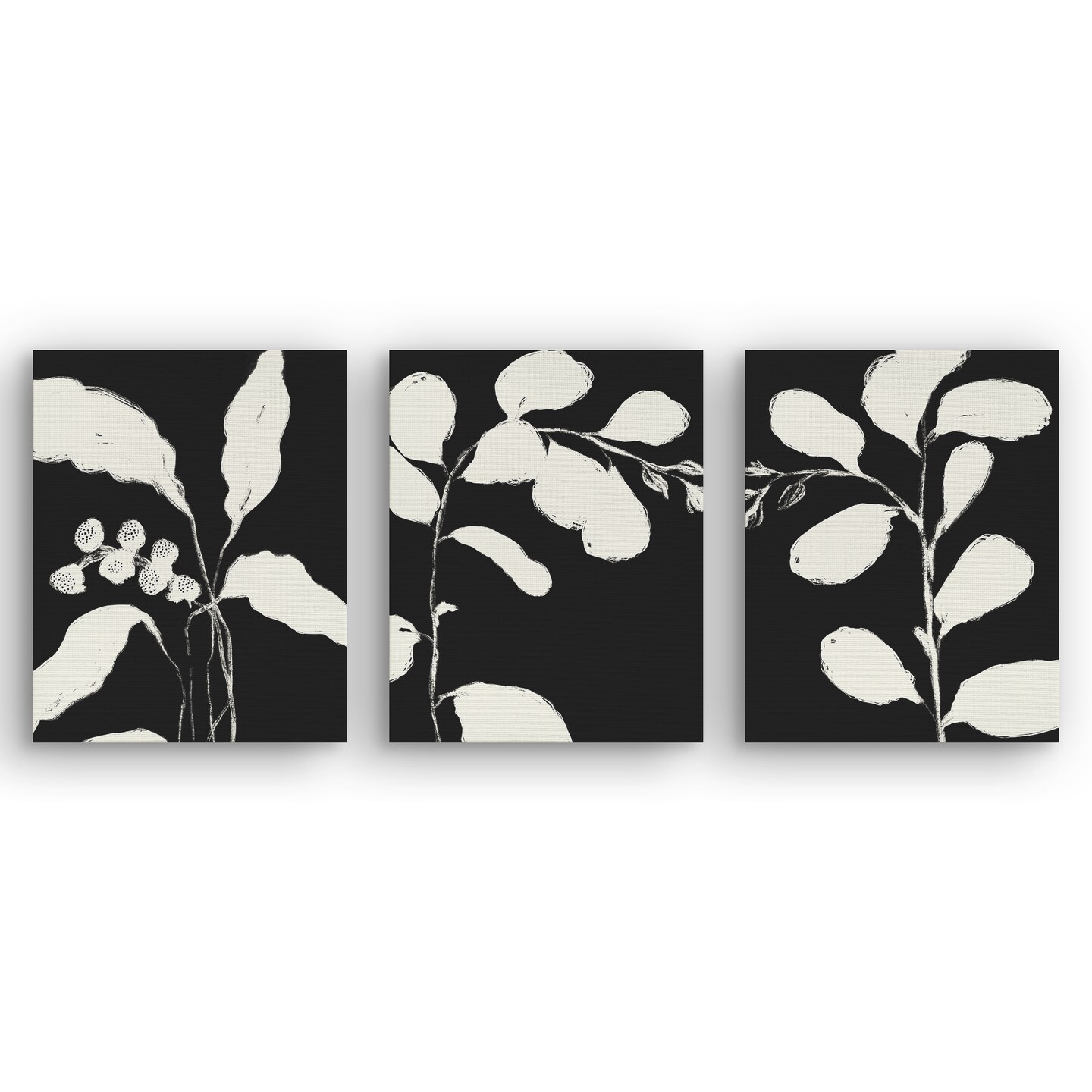 Americanflat Botanical Canvas Wall Art Featuring Cream Leaf Silhouettes - Black Background - Set of 3 - Gallery Wrap - Modern Wall Art