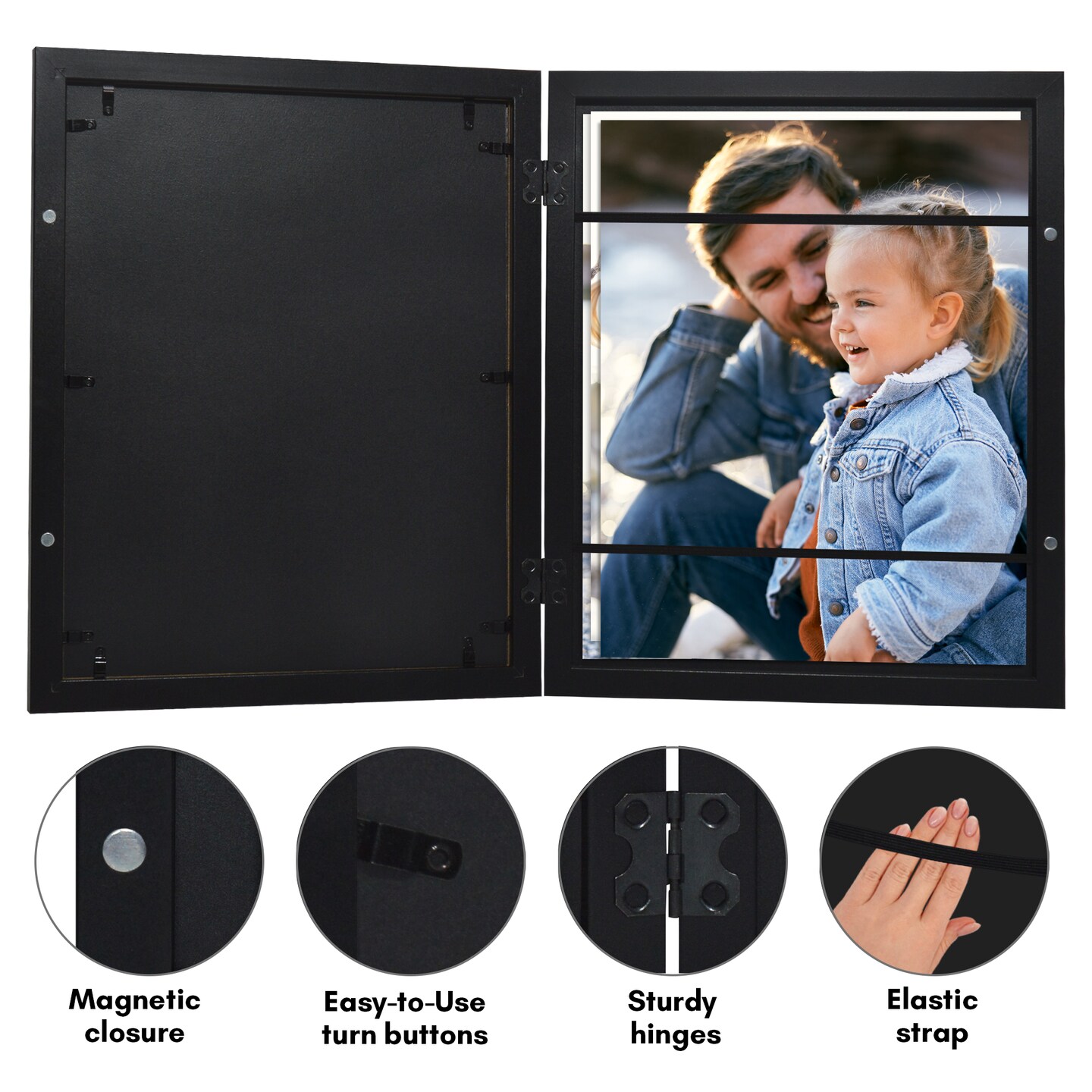 Americanflat Quick-Change Photo Storage Display Frame - Store up to 35 Pictures at Once with Elastic Strap Storage - Shatter Resistant Glass - Hanging Hardware - Includes Easel - Black