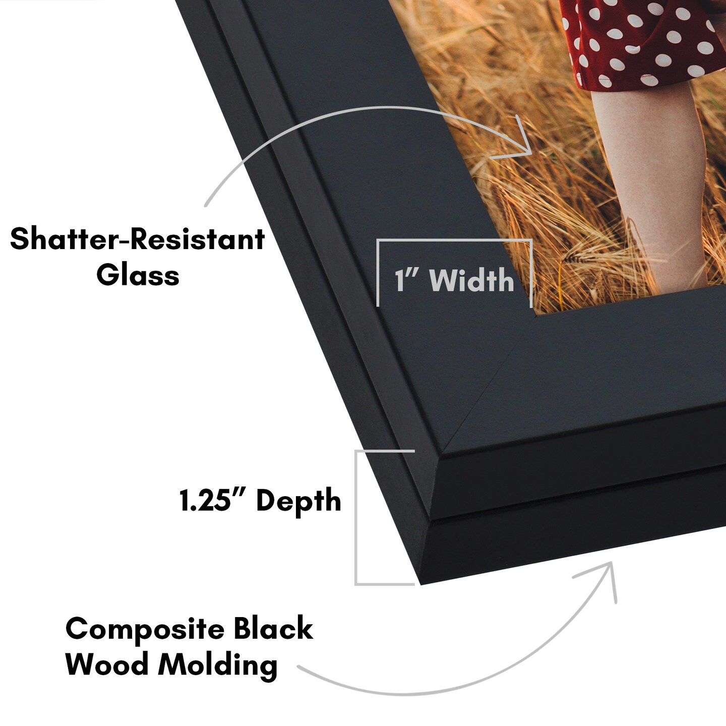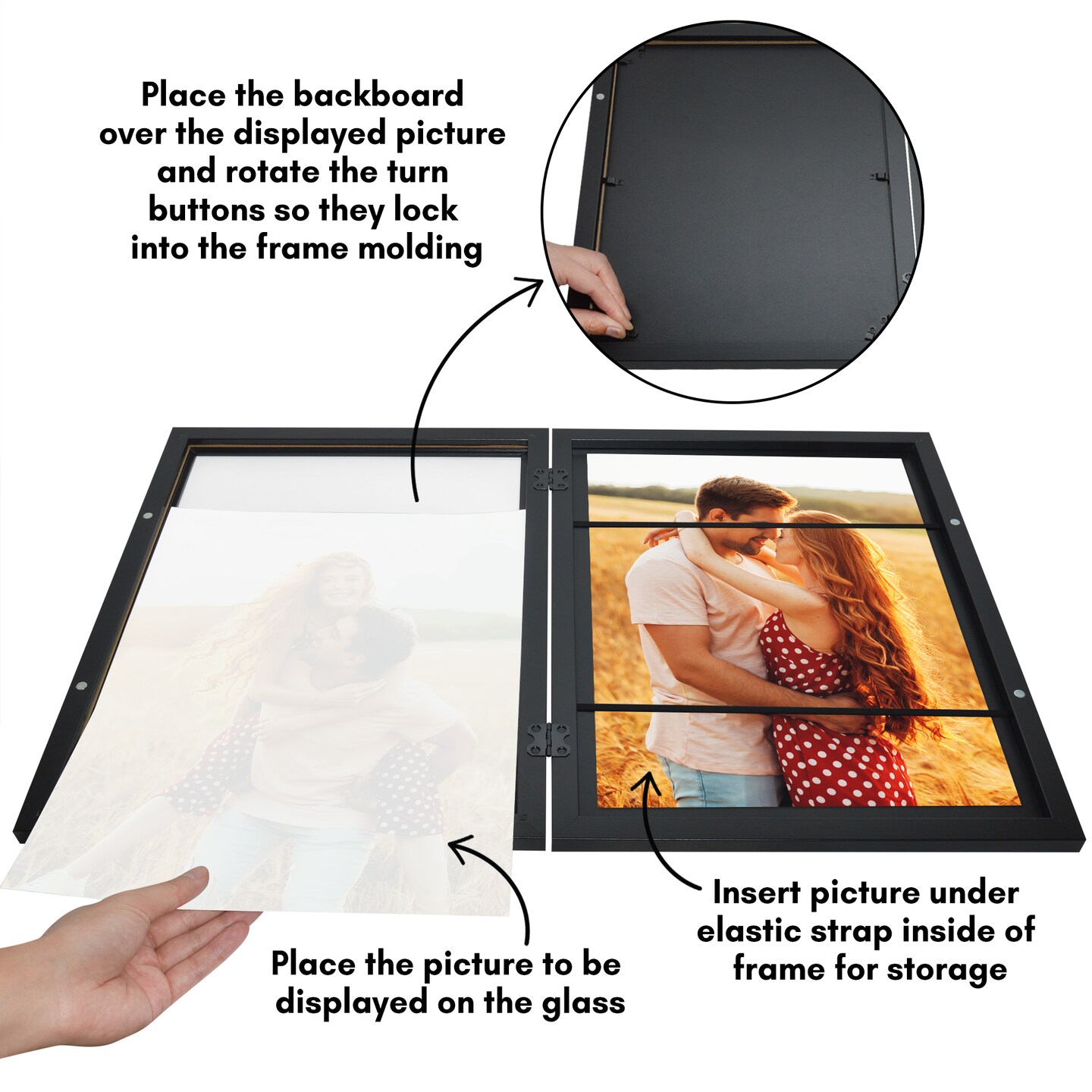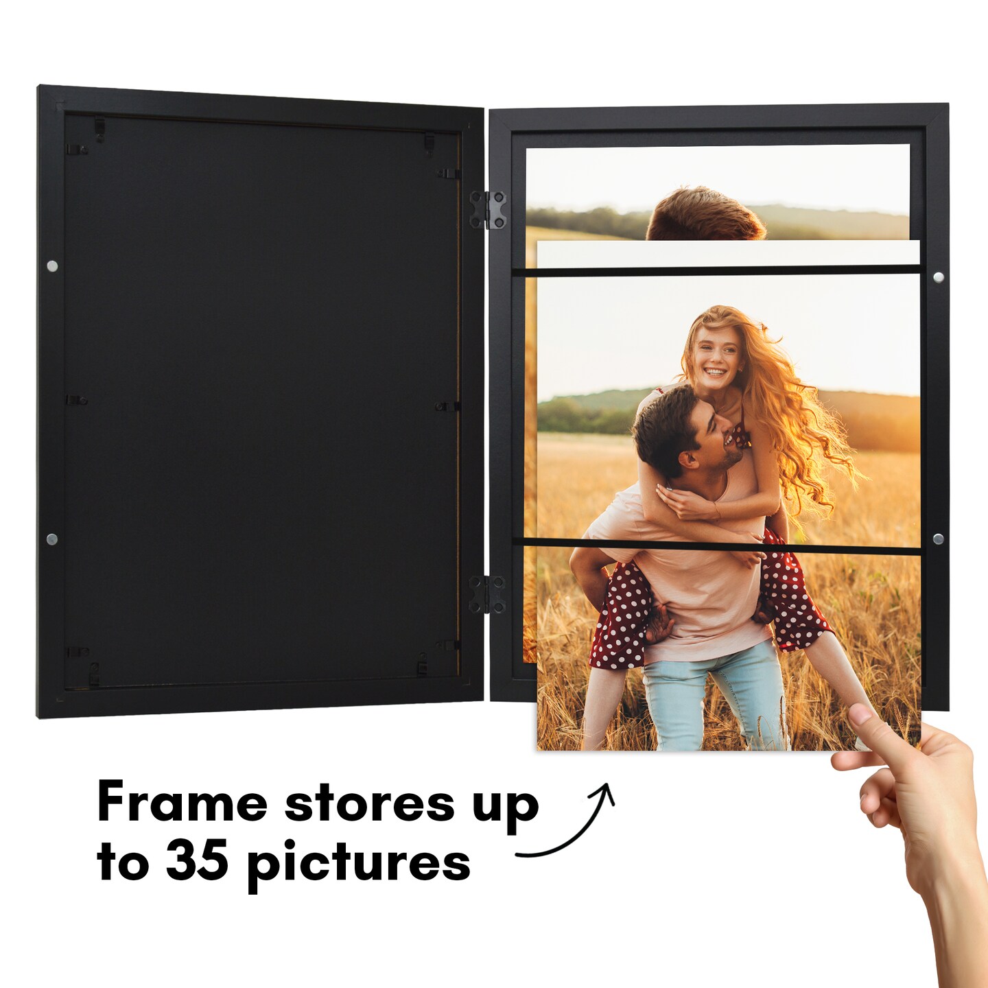 Americanflat Quick-Change Photo Storage Display Frame - Store up to 35 Pictures at Once with Elastic Strap Storage - Shatter Resistant Glass - Hanging Hardware - Includes Easel - Black
