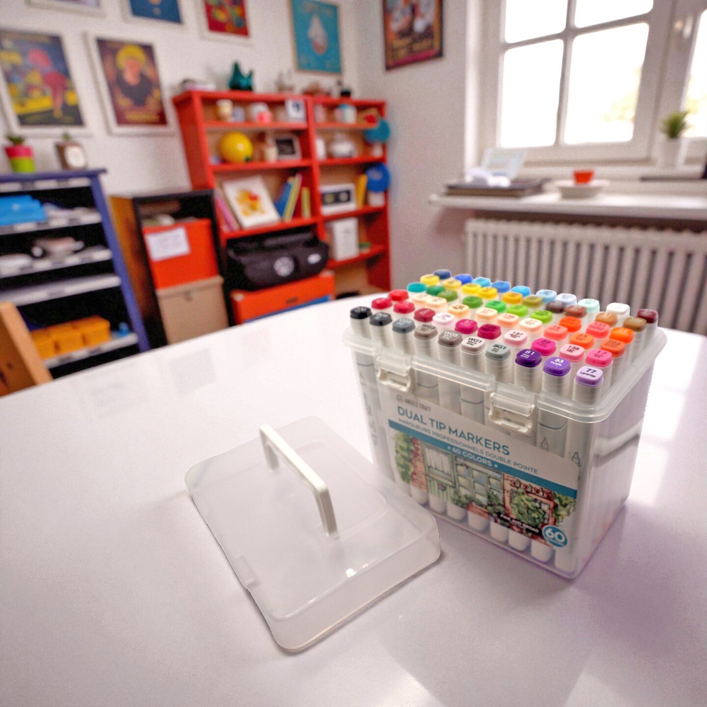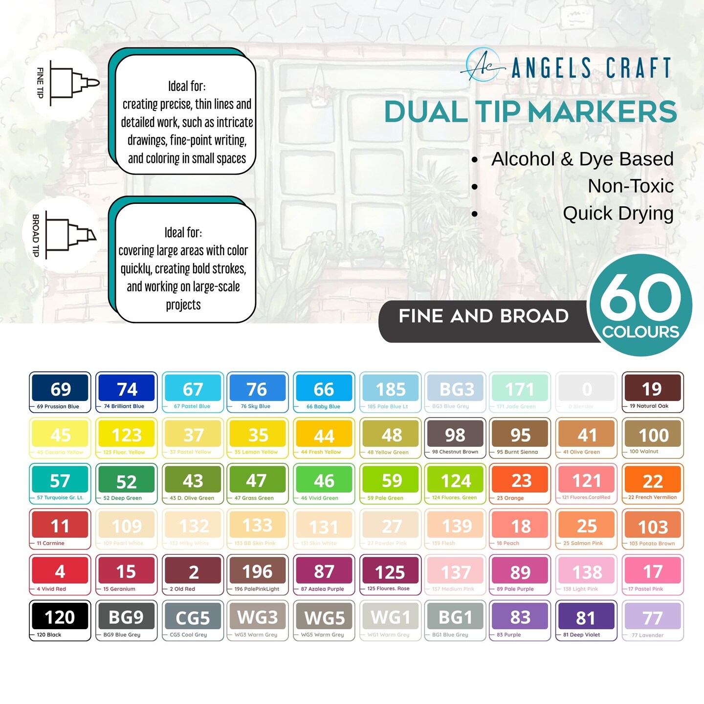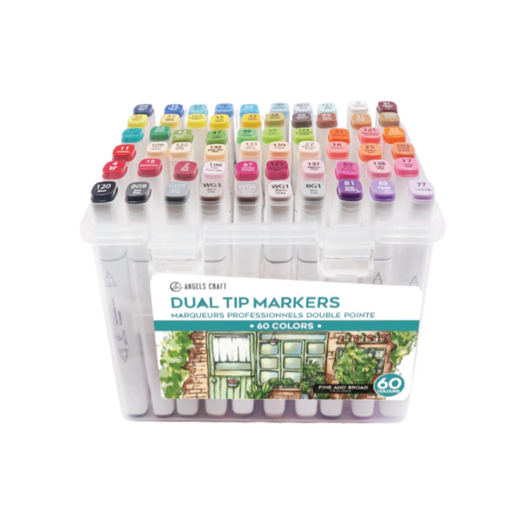 Angels Craft 60 Count Dual Tip Alcohol Markers in Primary Colors Includes Clear Plastic Storage Case