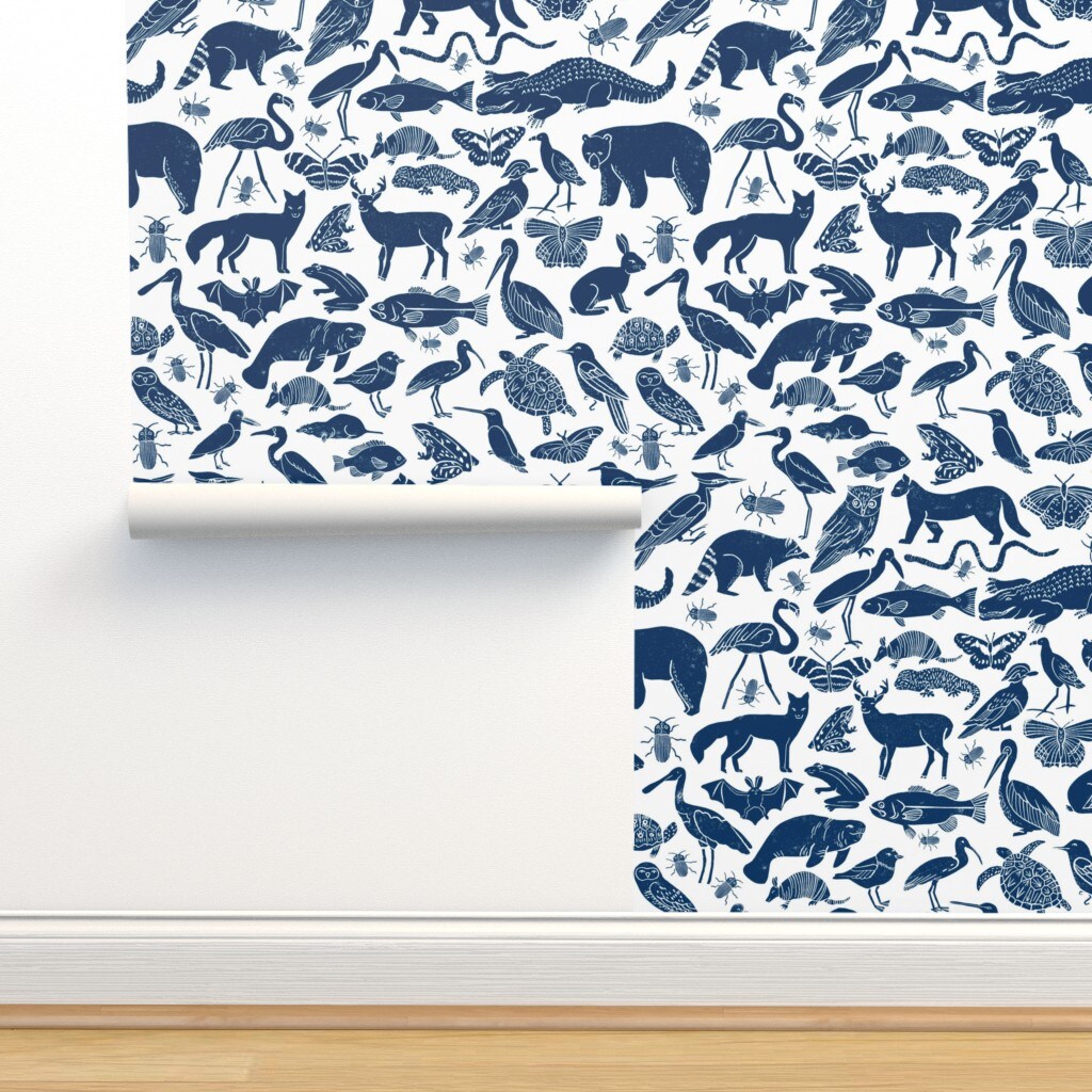 Animals Navy Blue Zoo Botanical Nursery Kids Custom Removable Wallpaper by Spoonflower Peel & Stick Wallpaper 2FT Wide