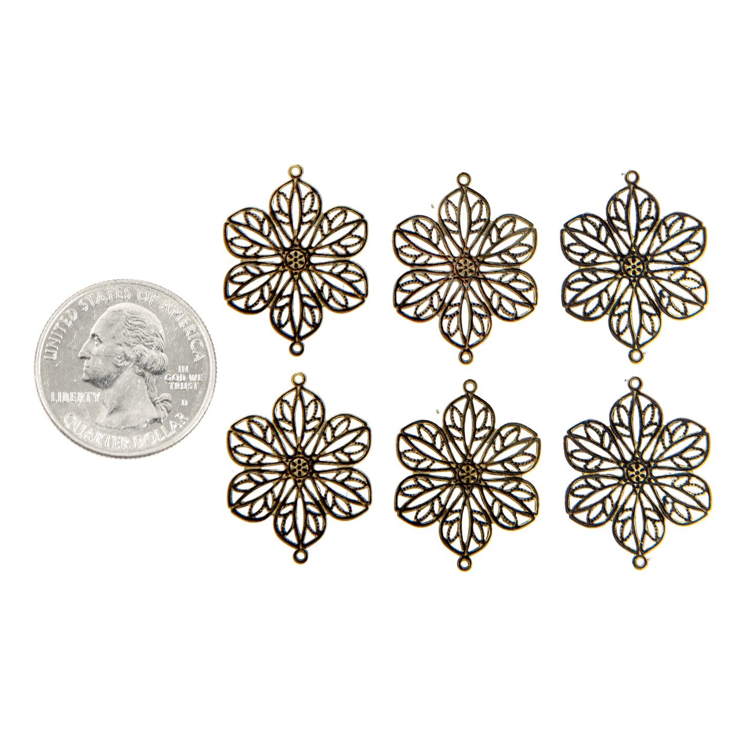 Antique Brass Wide Flower Filigree Two Ring Connectors Set of Six AB-2C20