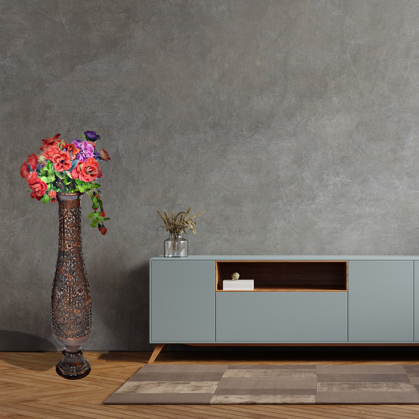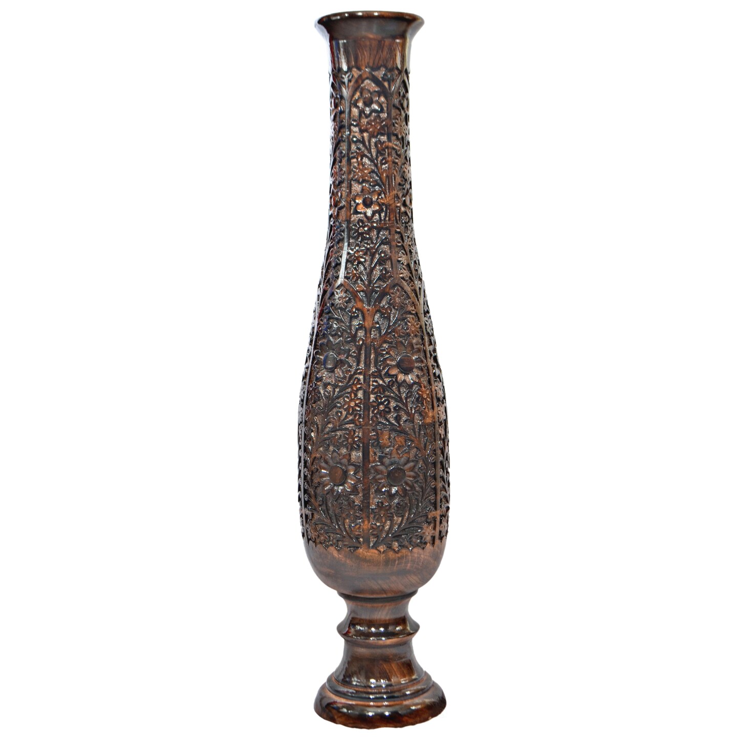 Antique Decorative Hand Curved Brown Mango Wood Floor Flower Vase Trumpet Design with Unique Textured Pattern, 36 Inch