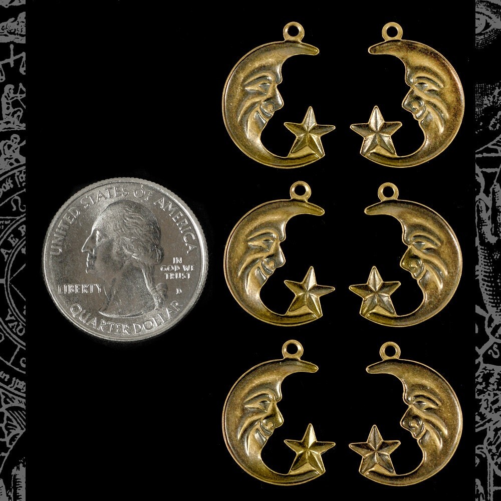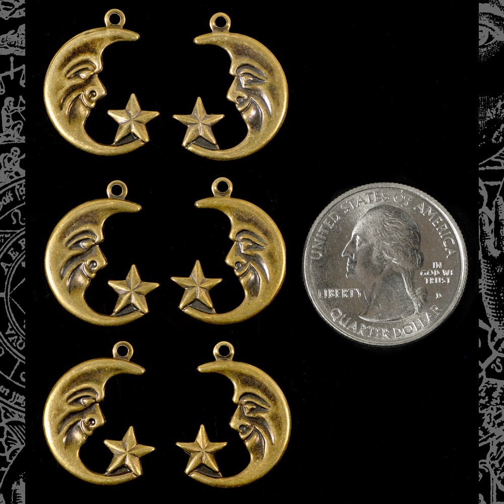 Antiqued Brass Moon and Star Charms - Set of Six - AB-C159