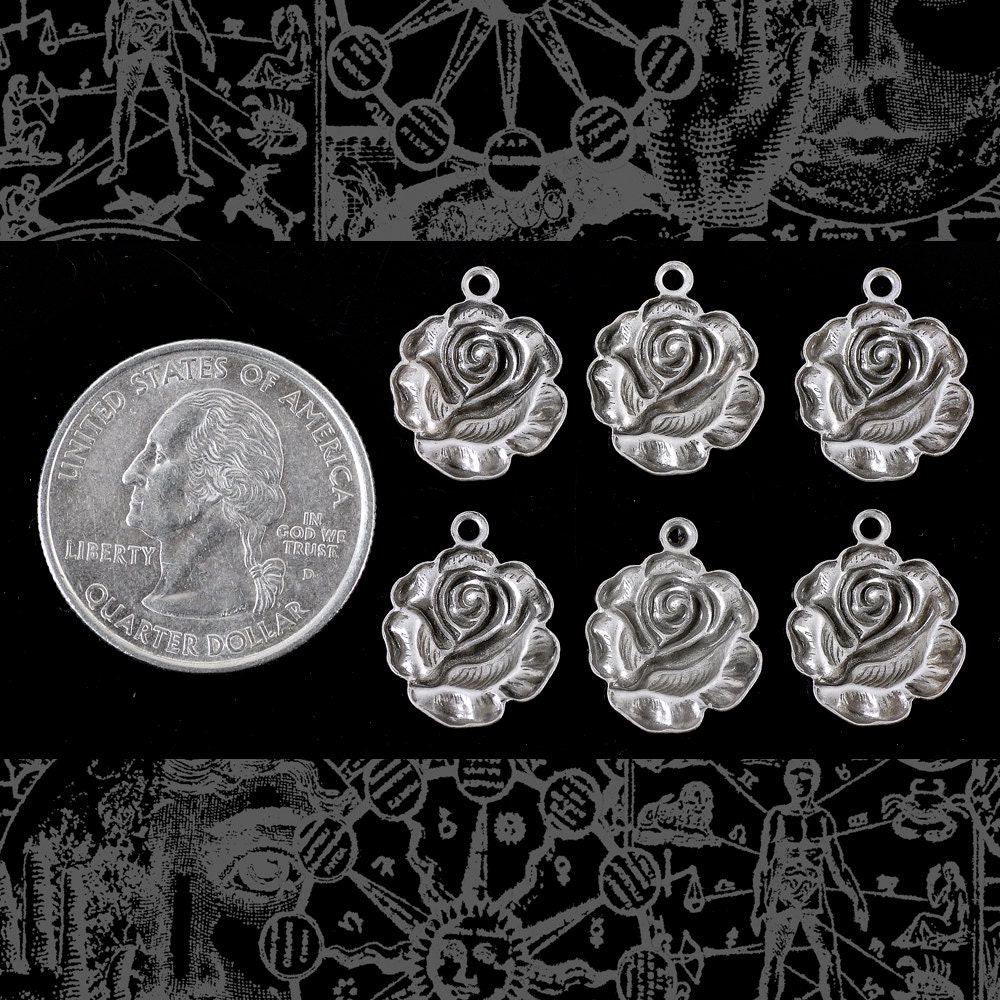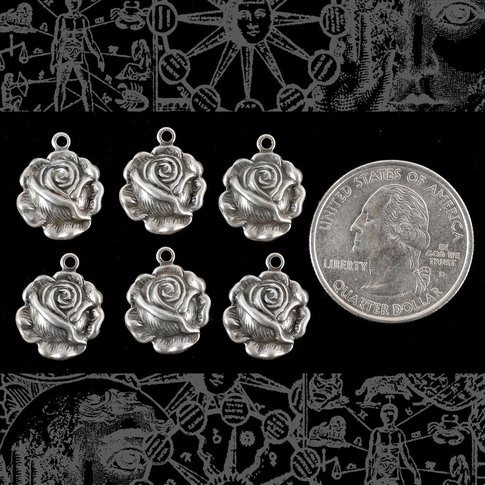 Antiqued Silver Plated Brass Blooming Rose Charms - Set of Six - S-C113