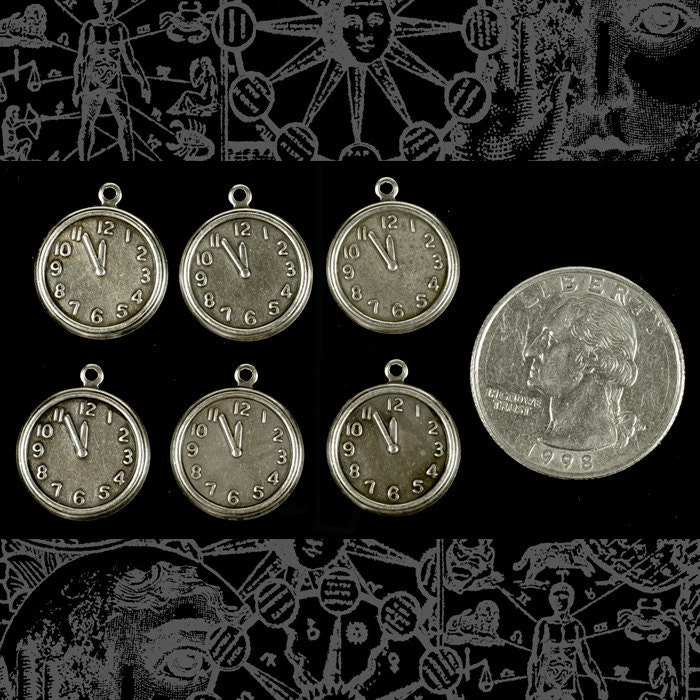 Antiqued Silver Plated Brass Clock or Mini-Pocket Watch Charms - Set of Six - S-C53
