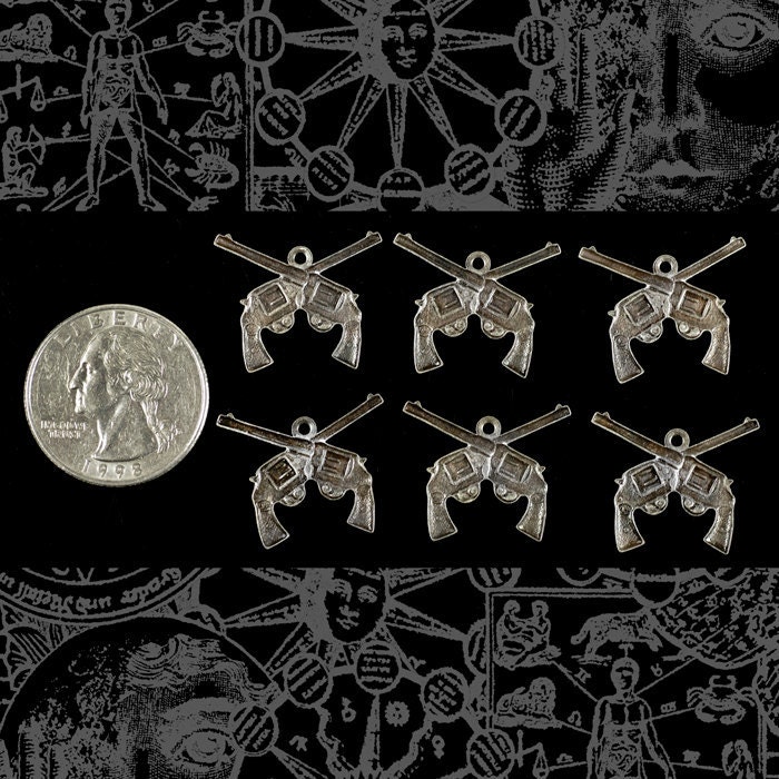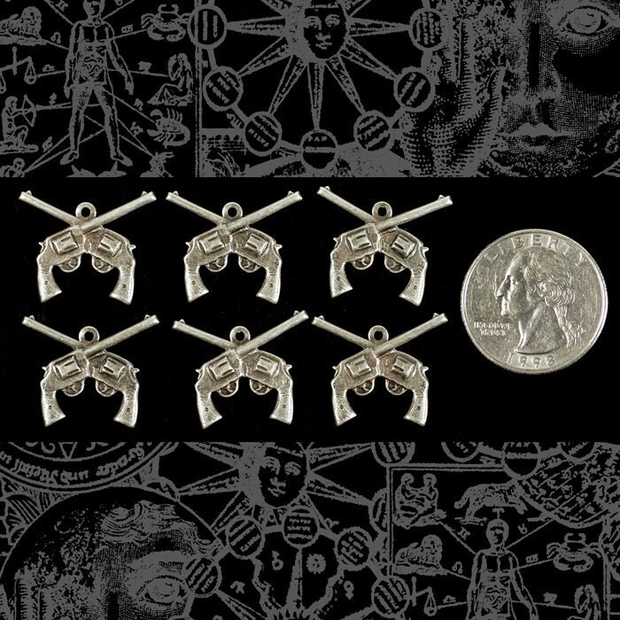 Antiqued Silver Plated Brass Crossed Six Shooter Gun Charms - Set of Six - S-C52