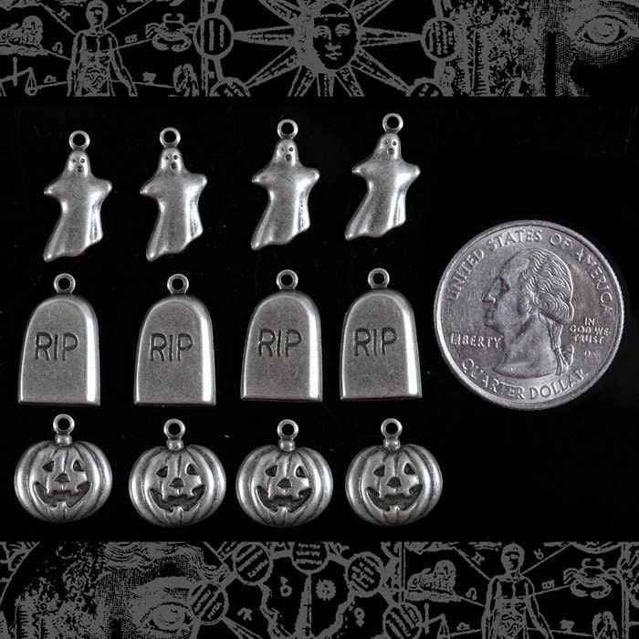 Antiqued Silver Plated Brass Halloween Charms Four Ghost Four Pumpkin and Four Gravestone Charms - Set of Twelve - S-CSet02