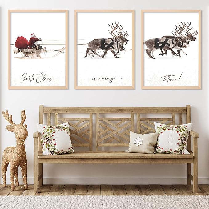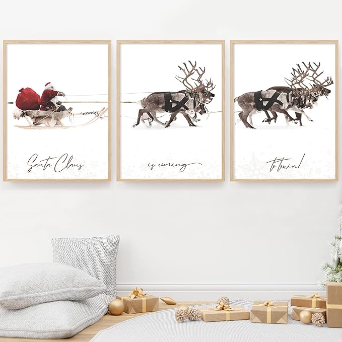 AnyDesign 3Pcs Christmas Wall Art Prints 12x16in Santa Claus Reindeer with Sleigh Art Poster Decor Large Aesthetic Xmas Posters Room Decor for Gallery Living Room Bathroom Wall Decor(UNFRAMED)