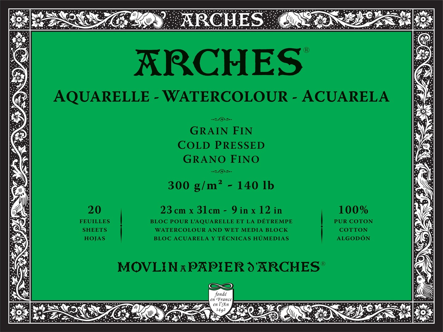 Arches Aquarelle Cold Pressed Watercolor Block 9"X12"- 140lb, 20 Sheets