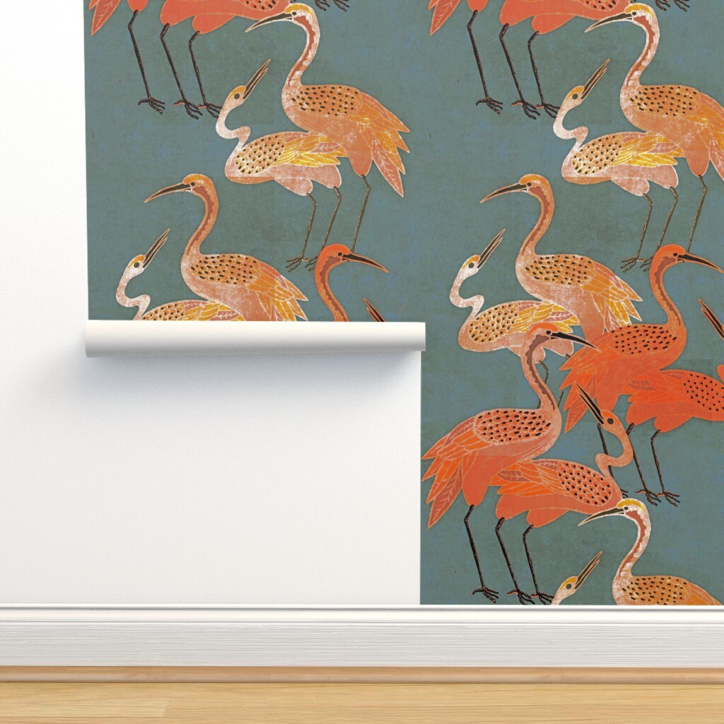 Art Deco Cranes Cocktail Blue Orange Birds Modern Coral Custom Removable Wallpaper by Spoonflower Peel & Stick Wallpaper 2FT Wide