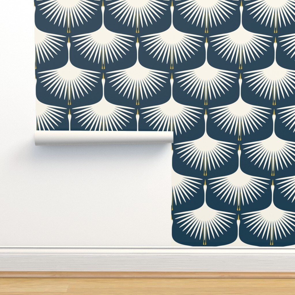 Art Deco Navy Bird Nature Swan Custom Removable Wallpaper by Spoonflower Peel & Stick Wallpaper 2FT Wide