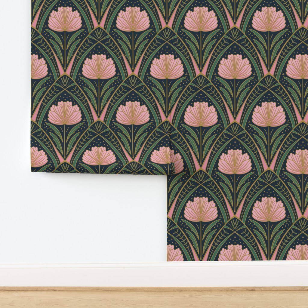 Art Deco Peony Dark Blue Pink Green Floral Abstract Botanical Nouveau Custom Removable Wallpaper by Spoonflower Peel & Stick Wallpaper 2FT Wide