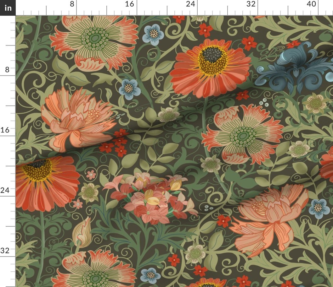 Art Nouveau Antique Floral William Morris Vintage Victorian Moody Arts And Crafts Garden Botanical Edwardian Green Red Custom Printed Fabric by Spoonflower Various Fabrics by the Yard or Fat Quarter