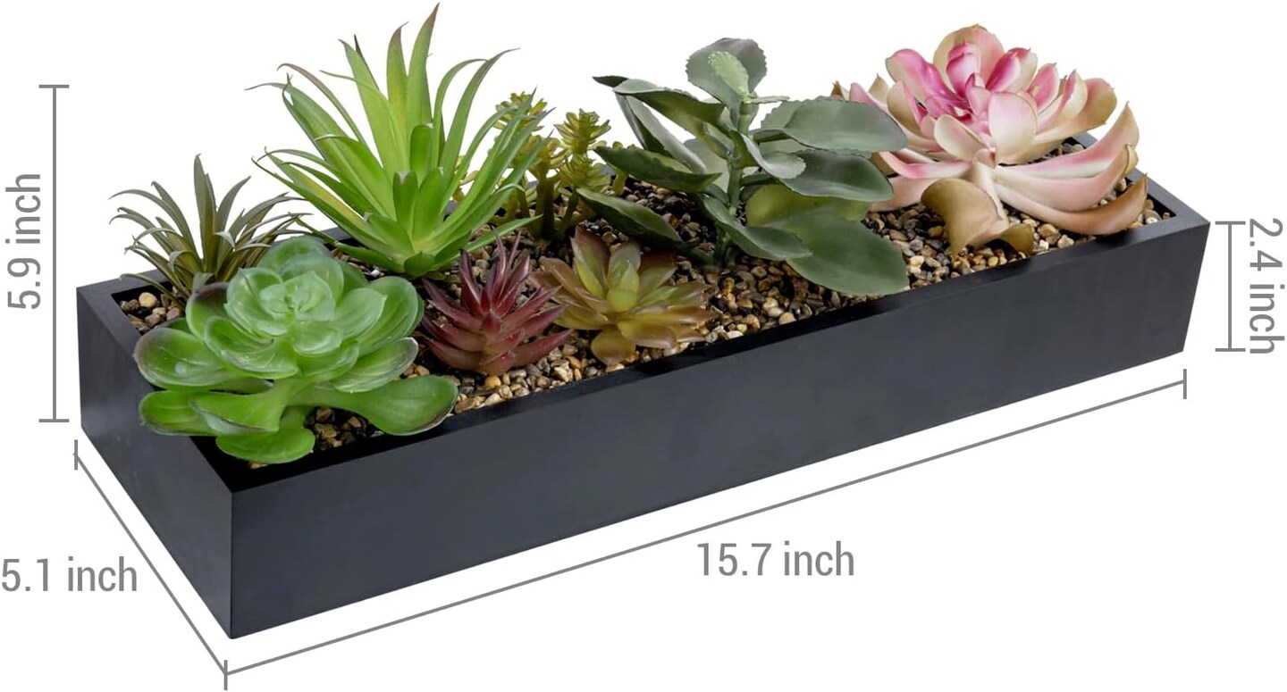Artificial Assorted Succulent Arrangement in Rectangular Black Wood Planter Box, Fake Plant Decor
