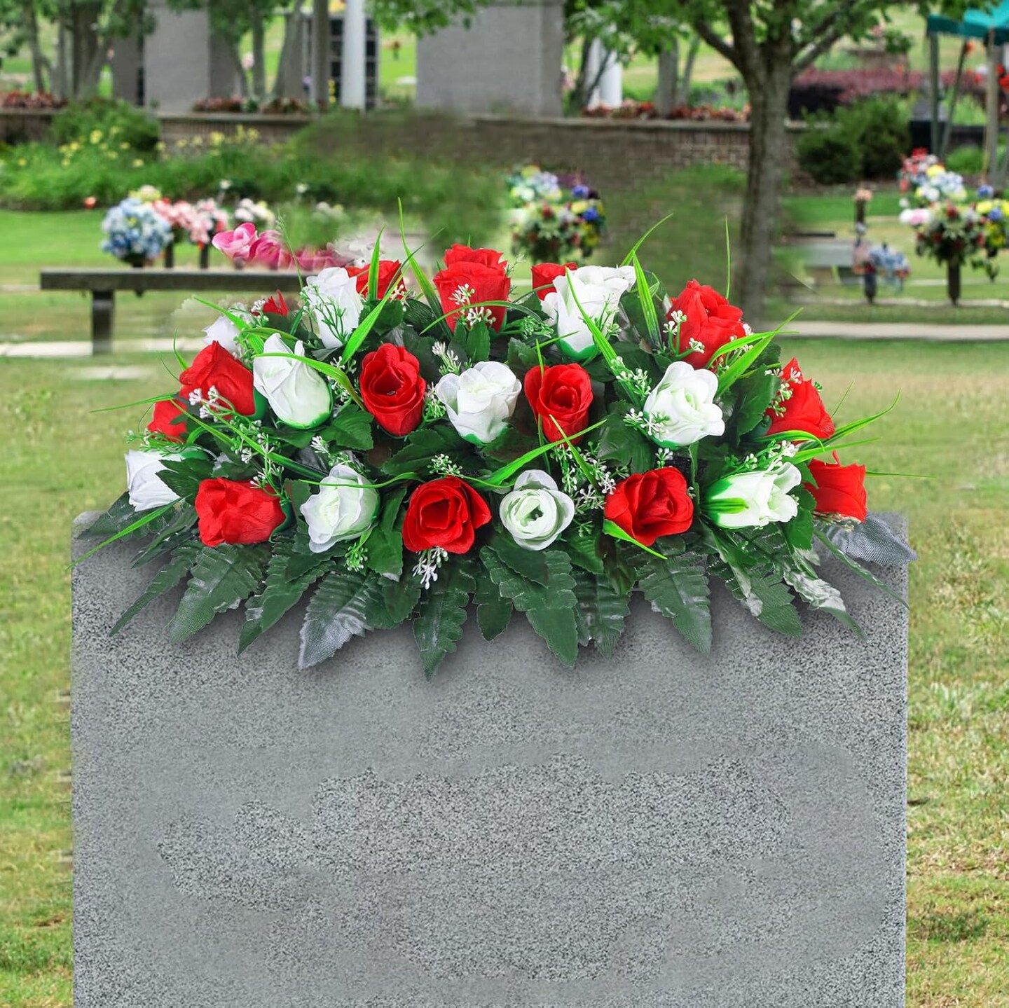 Artificial Cemetery Flower Saddle – Red & White Silk Roses, Outdoor Headstone Memorial Flowers for Gravesites, Tombstone Decoration