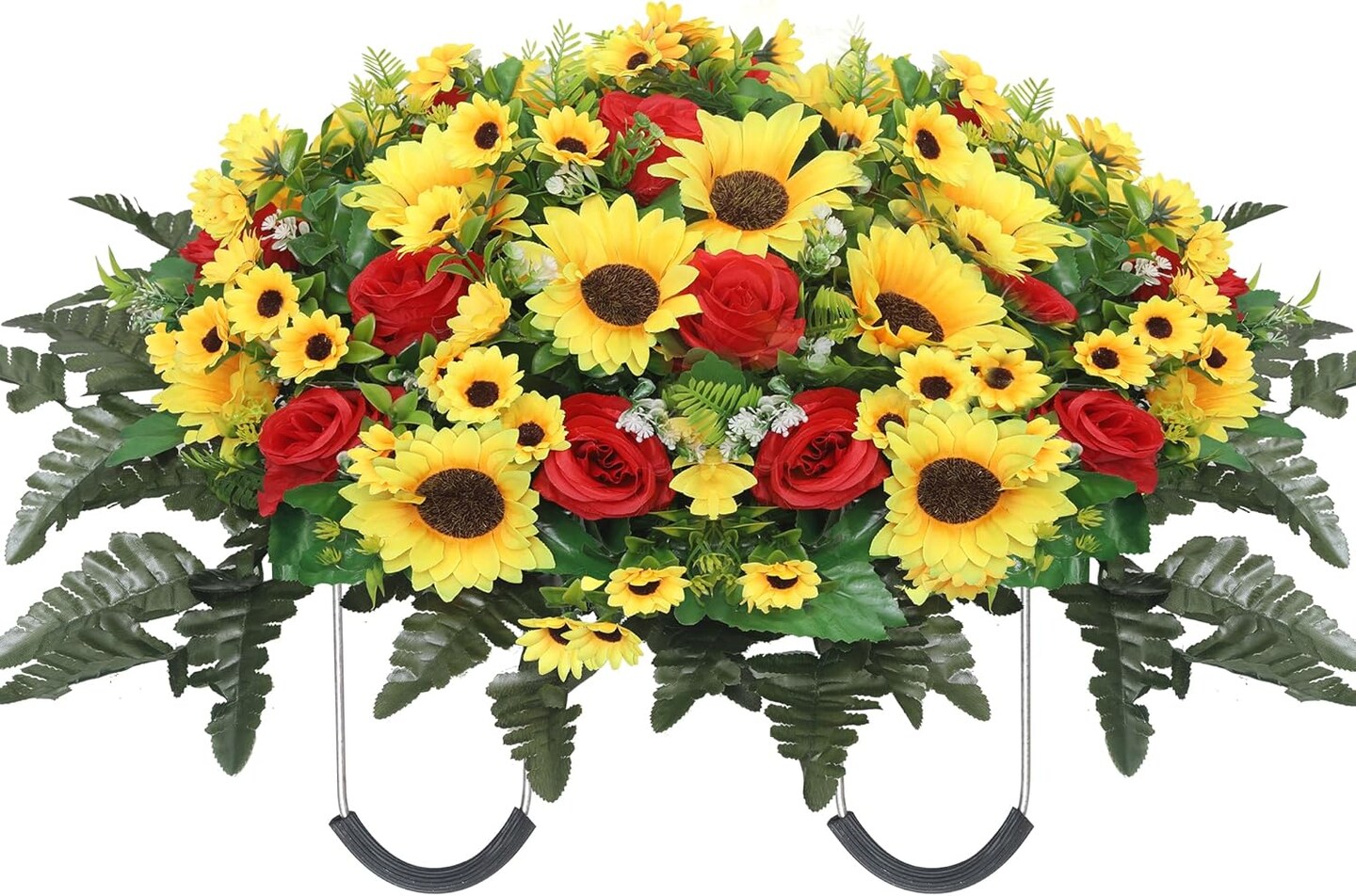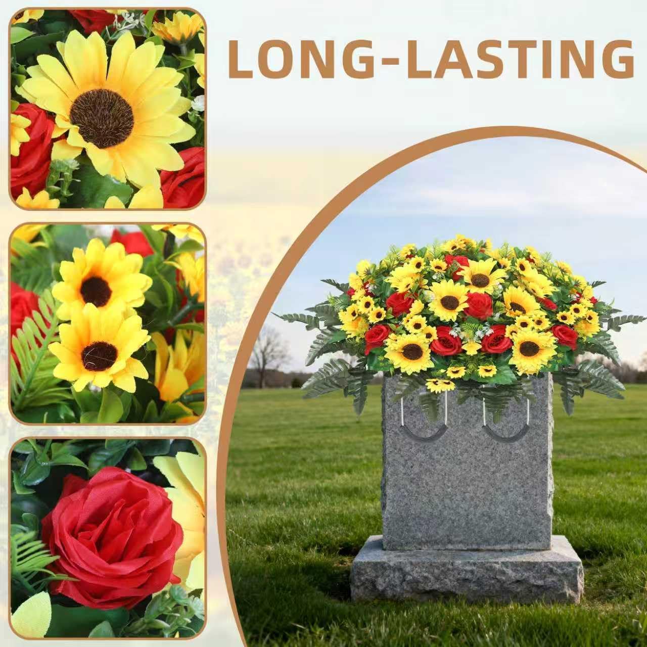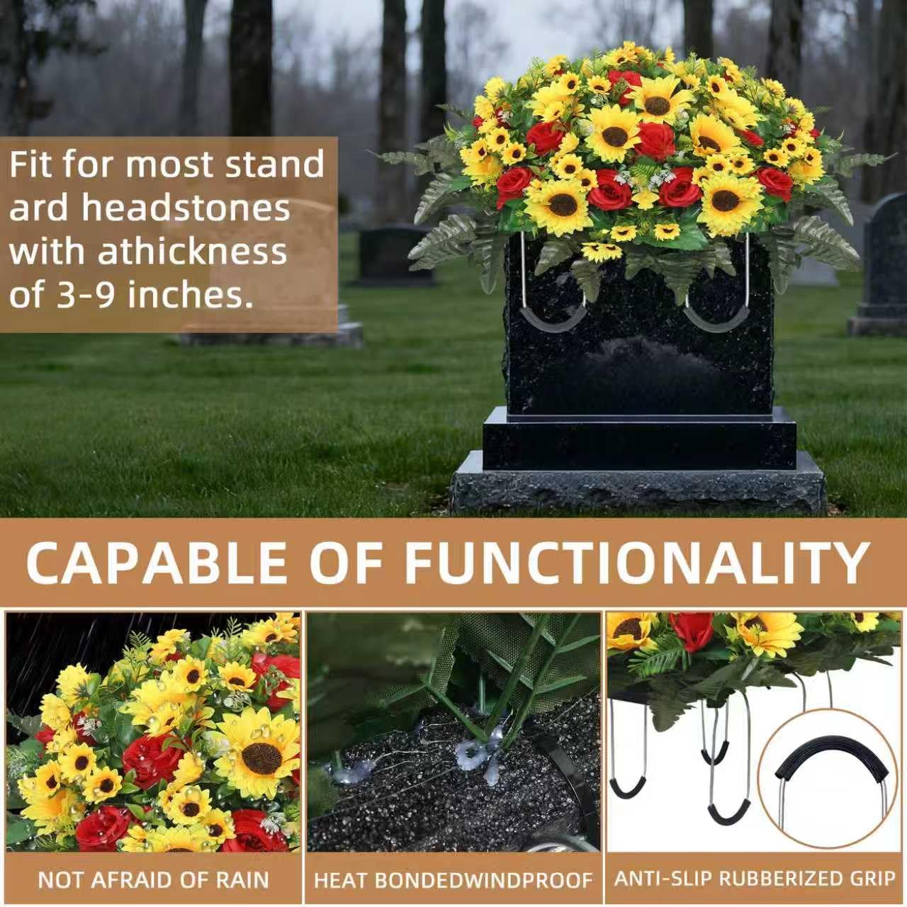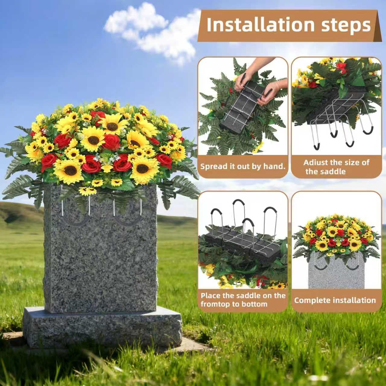 Artificial Cemetery Flowers – Red Silk Sunflower Headstone Flower Saddle for Gravesite Memorial & Outdoor Grave Decoration