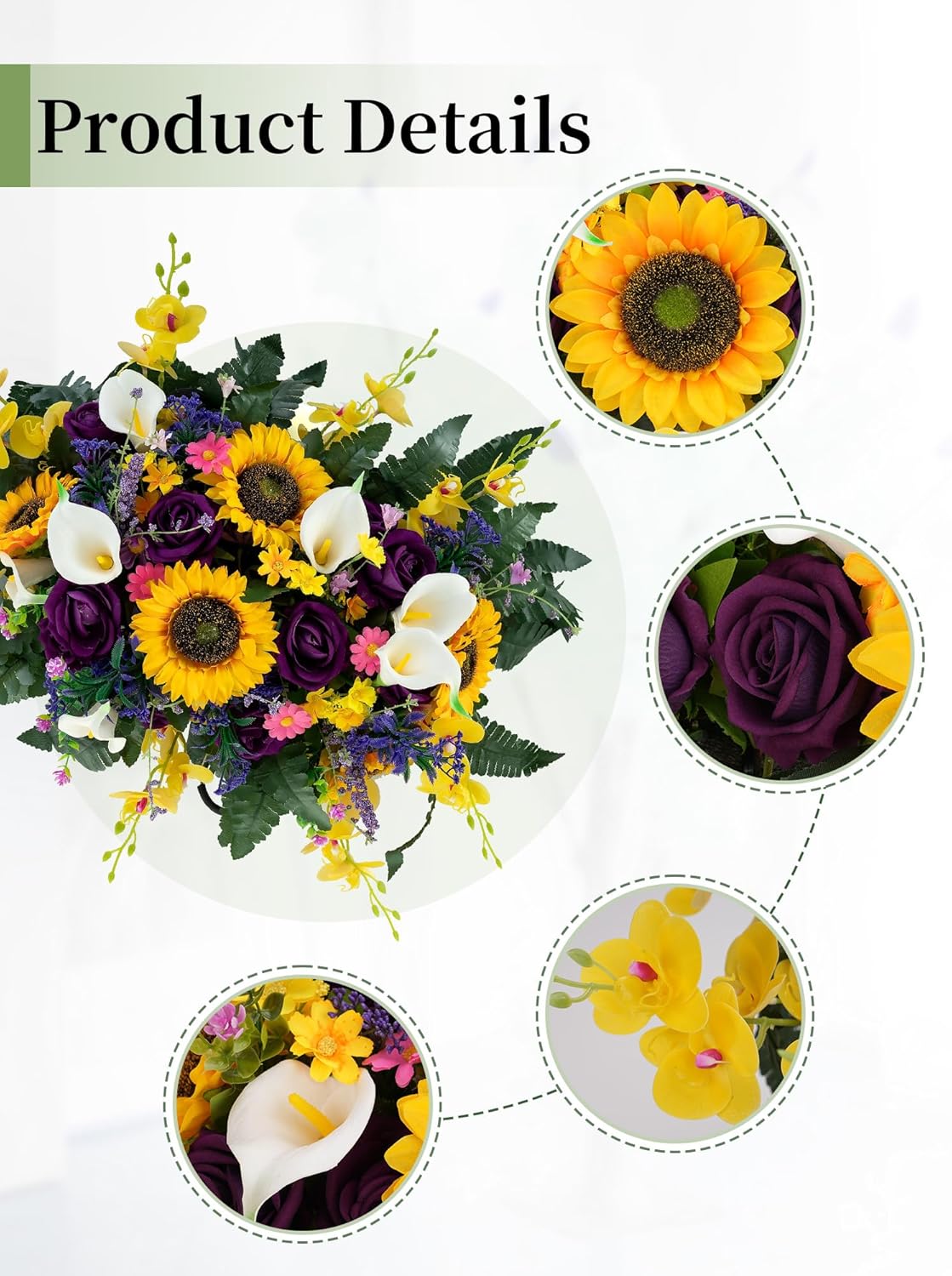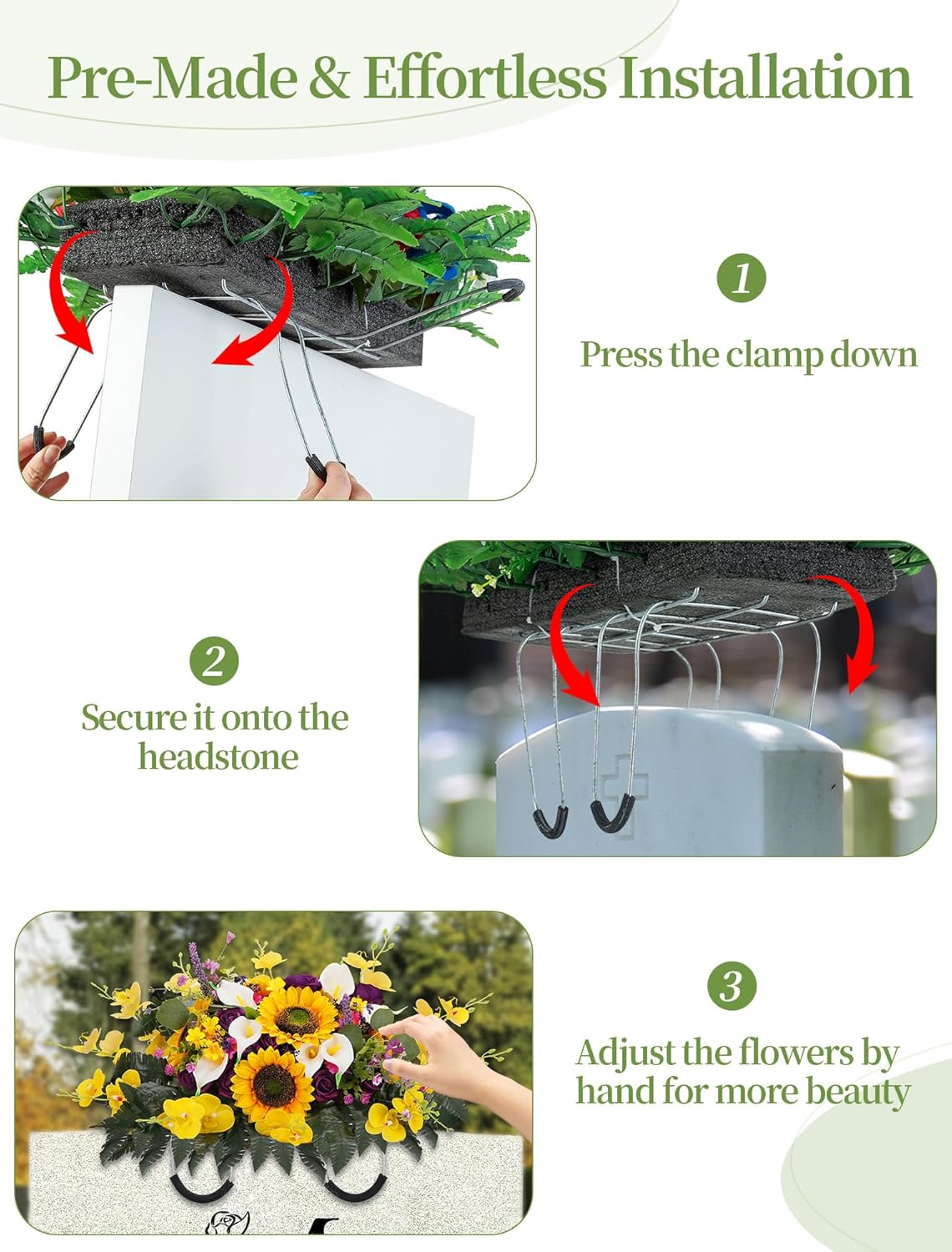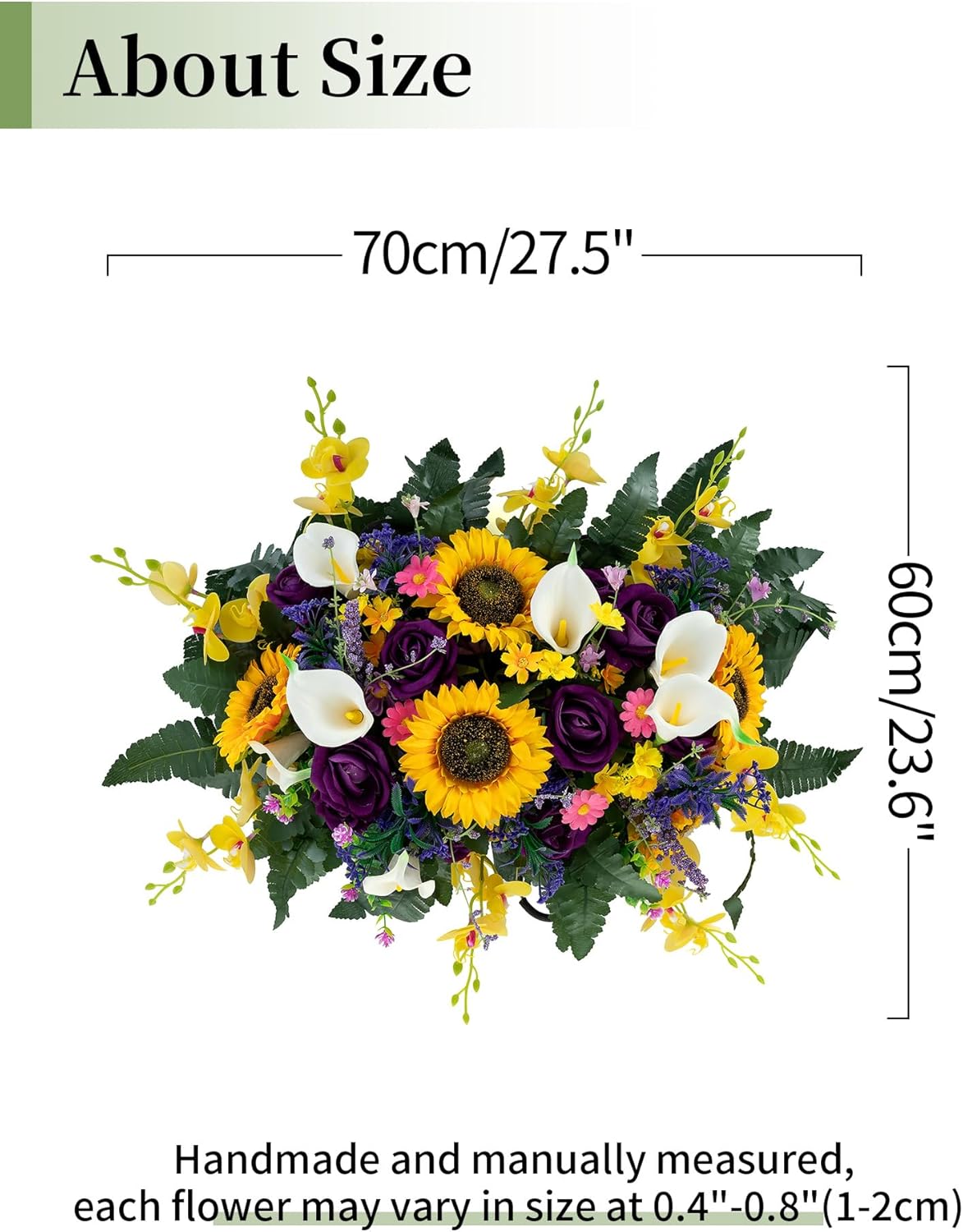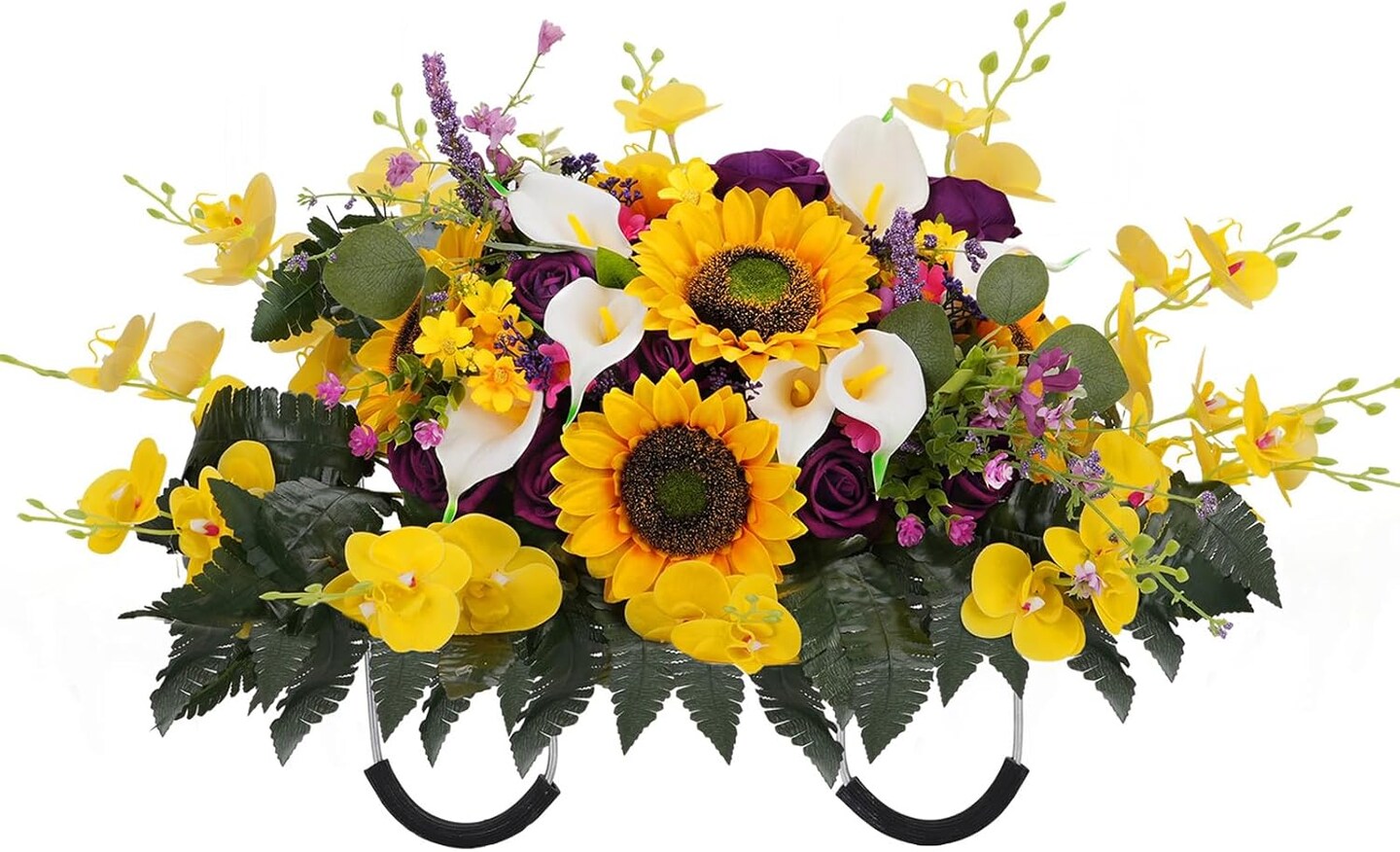 Artificial Cemetery Headstone Flower Saddle – Rose & Sunflower Grave Decoration, Outdoor Memorial Arrangement, Spring Tribute for Loved Ones
